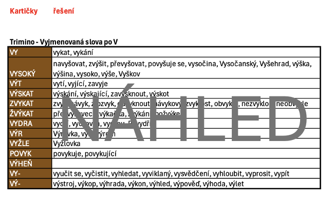 Obsahuje sadu 72 karet se slovy vyjmenovanými a příbuznými.