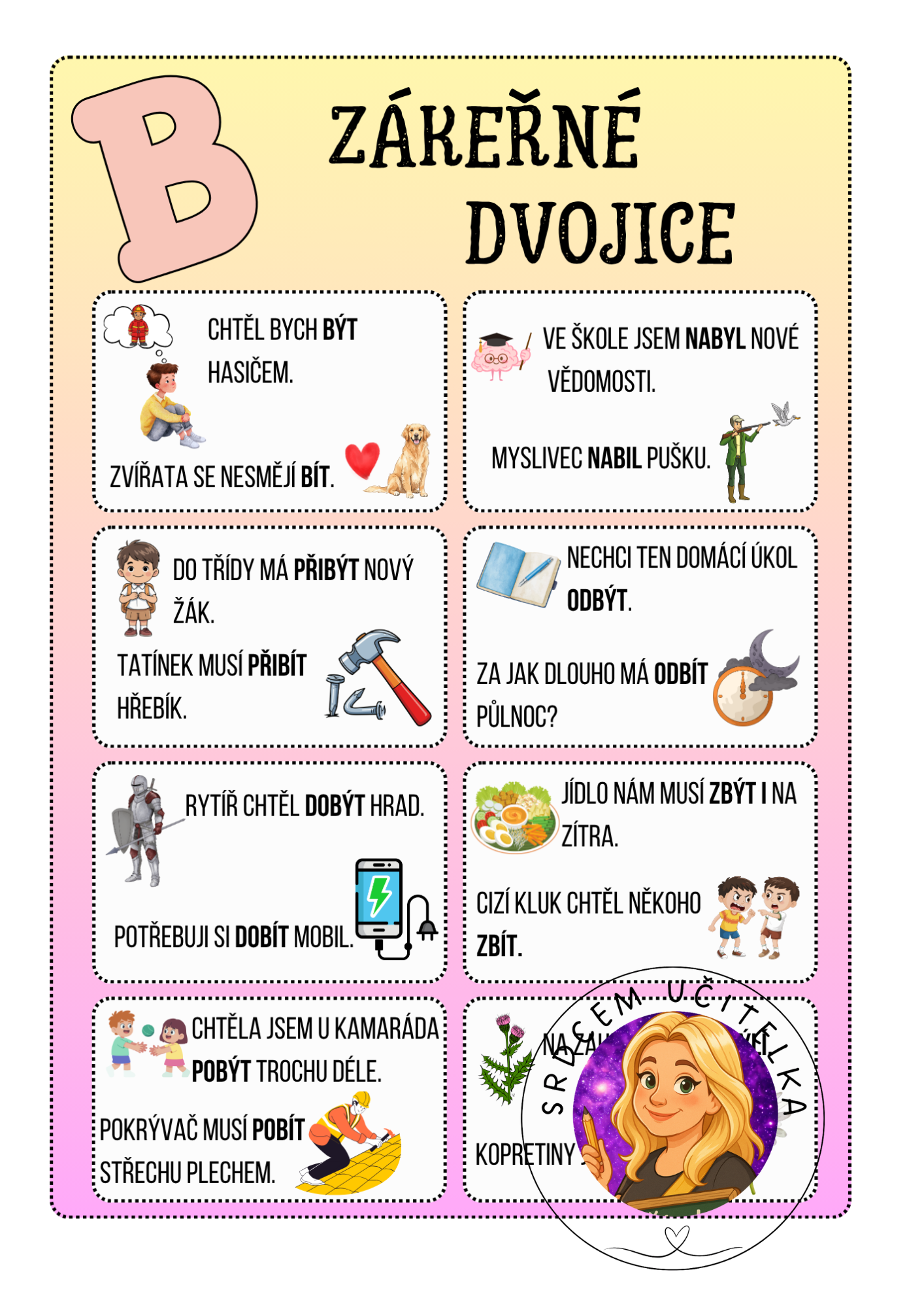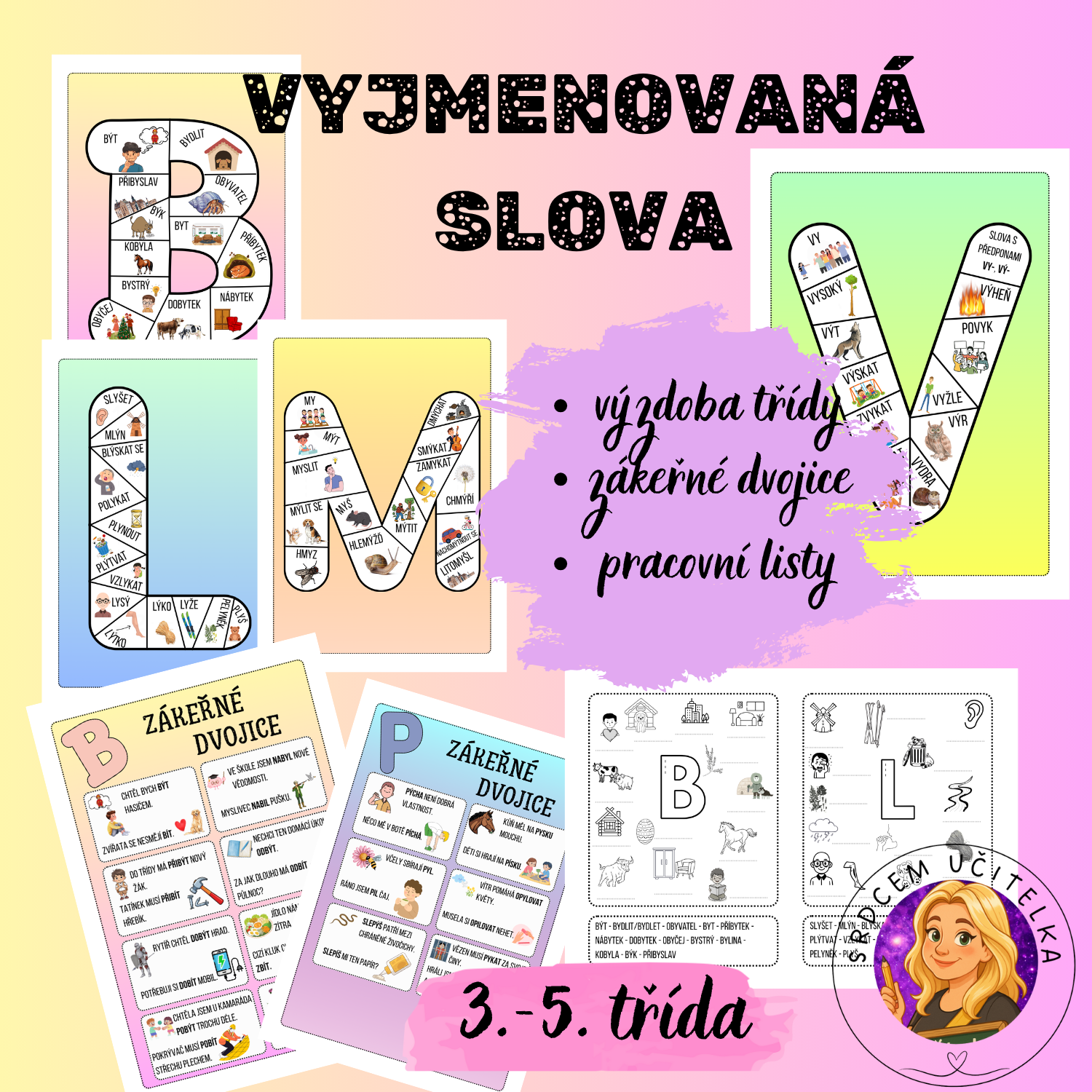 Materiál k vyjmenovaným slovům, který ušetří čas, zpřehlední výuku a zároveň děti baví. Materiál je koncipovaný tak, aby podporoval pochopení významů slov, procvičování i práci v sešitě.