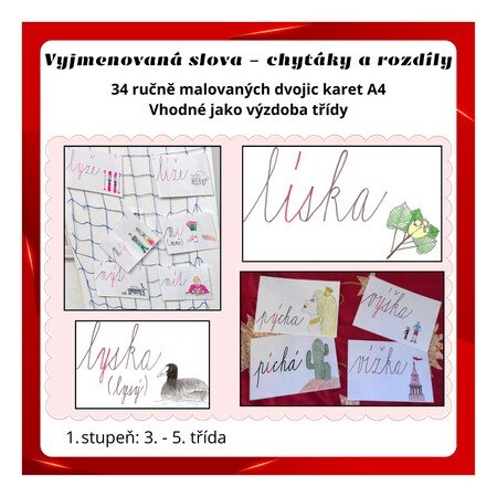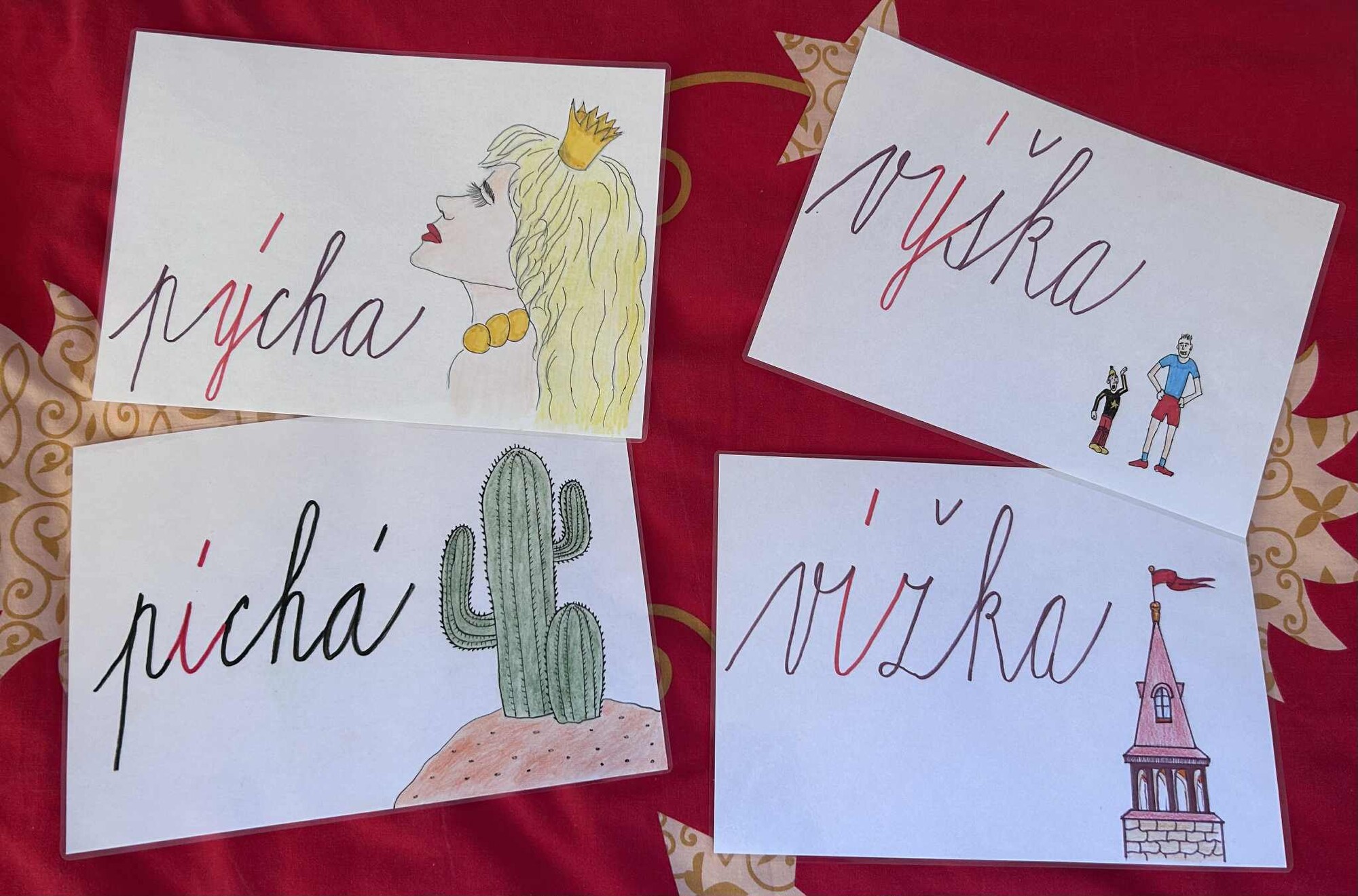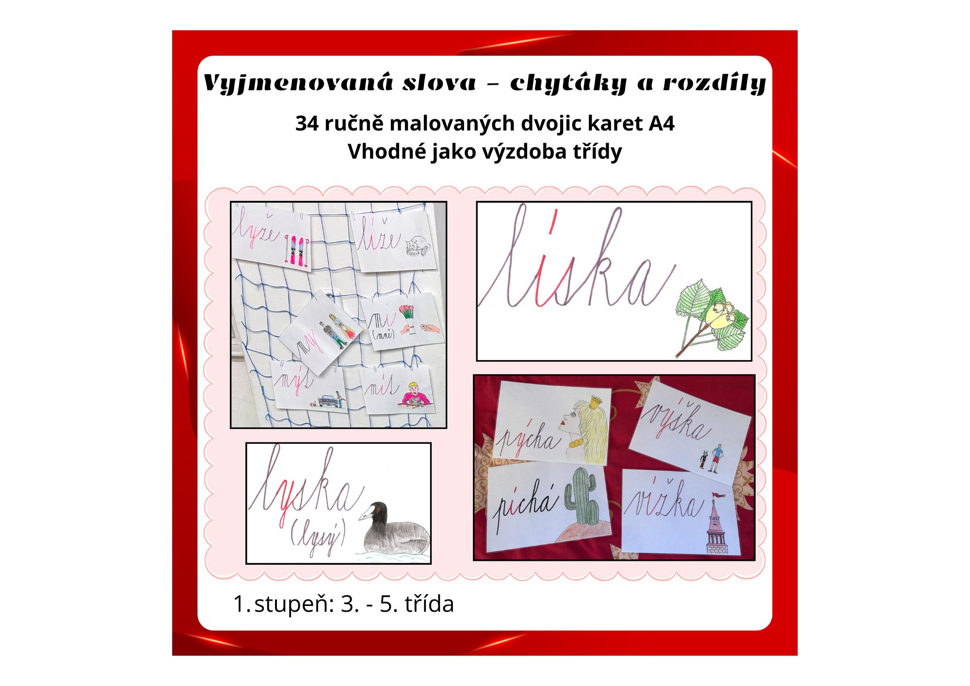 34 karet (17 dvojic) zaměřených na nejčastější rozdíly a chytáky mezi vyjmenovanými slovy. Karty je vhodné vytisknout, zalaminovat a vyvěsit ve třídě.