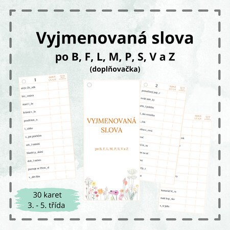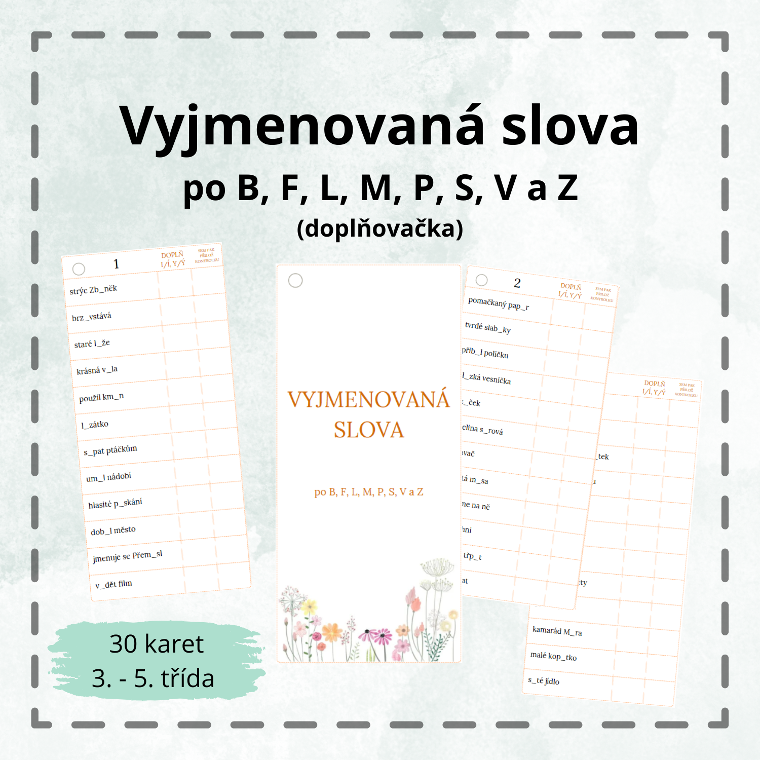 Materiál obsahuje celkem 30 kartiček se slovními spojeními, ve kterých si žák procvičí všechna vyjmenovaná slova a slova příbuzná. Vše včetně řešení.