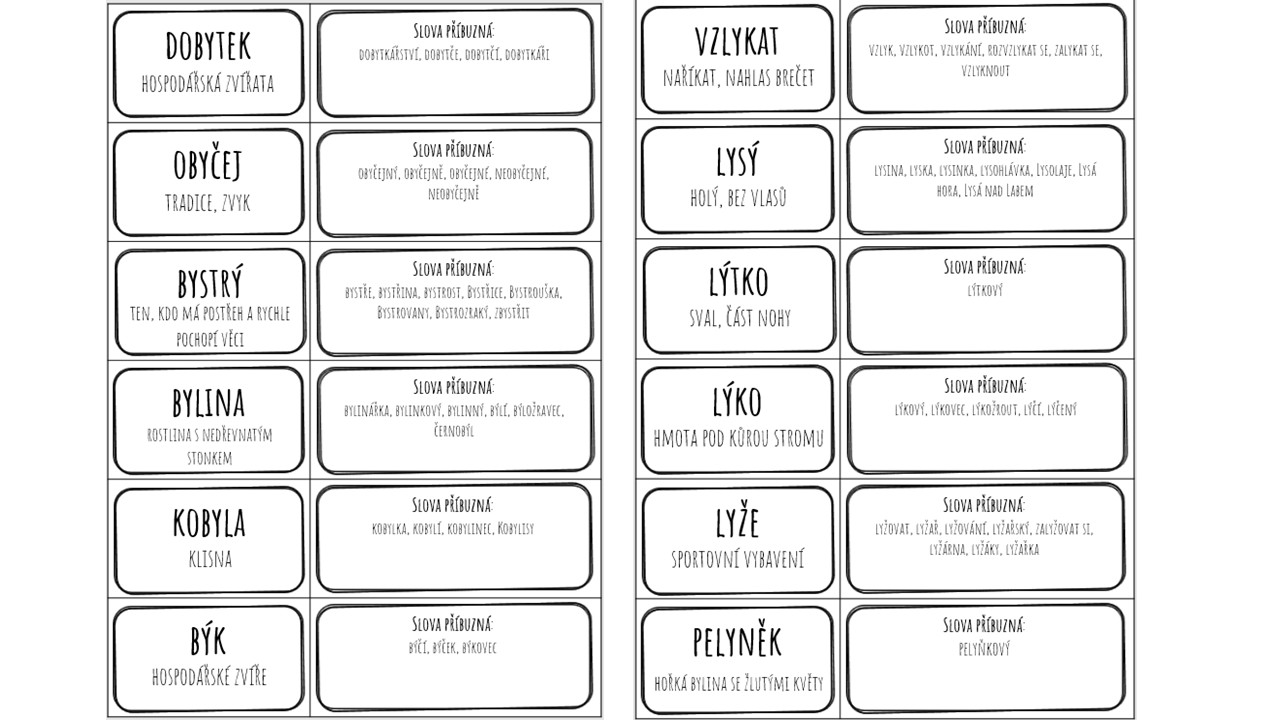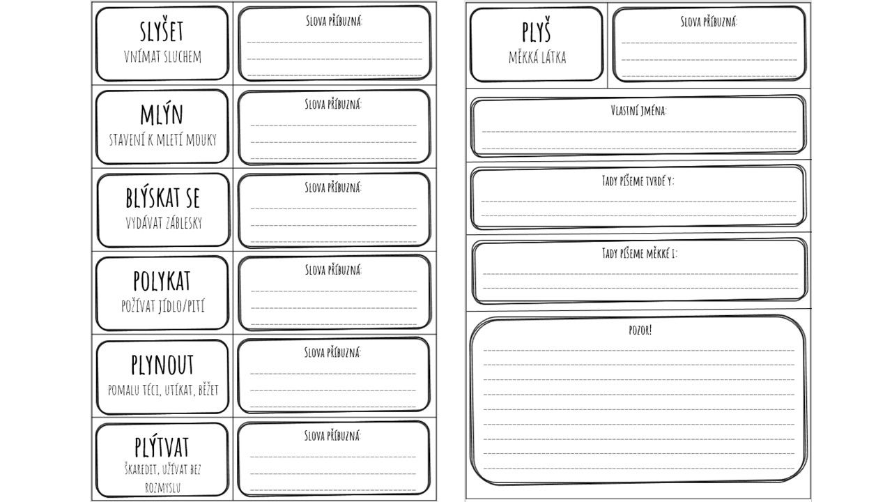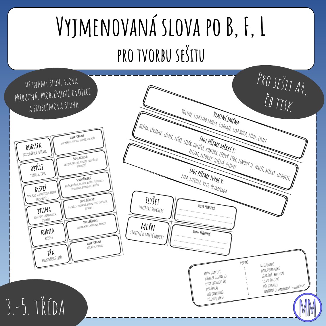 Vytvořte si s dětmi sešit, ve kterém budou mít kompletní přehled vyjmenovaných slov po B, F, L s jejich významy, problémovými dvojicemi nebo slovy, ve kterých se často chybuje. Využijte již doplněnou variantu, či volné kartičky s linkami.