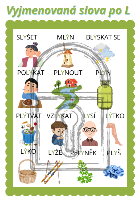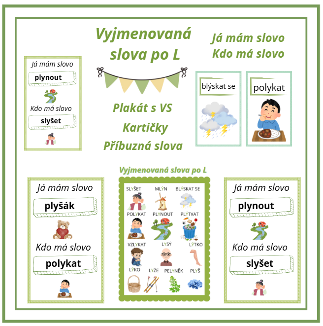 Co budete potřebovat na přípravu? • Tiskárnu s barevným tiskem, laminovačku, fólie, nůžky, gumičky na vystřižené kartičky Soubor obsahuje: 8 listů na podporu upevnění látky českého jazyka: Vyjmenovaná slova po L. Listy je vhodné zalaminovat a vystřihnout. Následně můžeme využít pro práci s dětmi na koberci, v lavicích, ale i jako výzdobu na nástěnku. Soubor obsahuje: 1. Plakát s vyjmenovanými slovy po L 2. Demonstrační kartičky, které lze využít i jako pexeso (nutné dvakrát strany vytisknout) 3. Hru: Já mám slovo, kdo má slovo Co se dítě naučí? • hravou formou si upevní vyjmenovaná slova po L