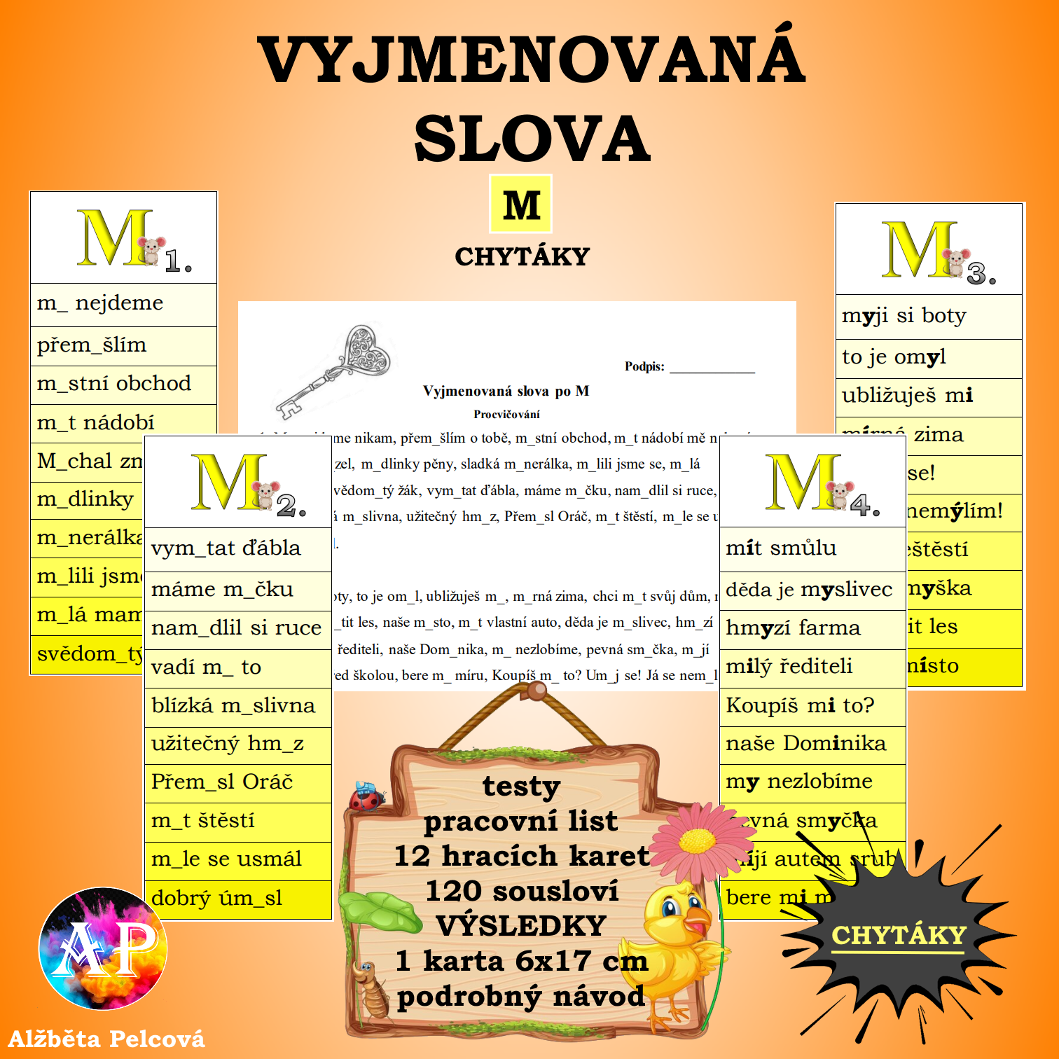 Sloupečky obsahují sousloví s vyjmenovanými slovy po M. Celý soubor je zaměřen na chytáky ve vyjmenovaných slovech typu MÍT x MÝT.