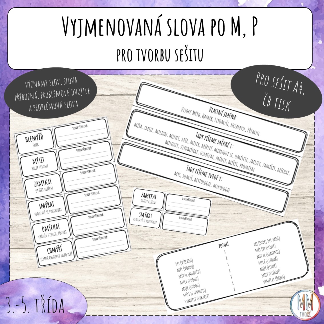 Vytvořte si s dětmi sešit, ve kterém budou mít kompletní přehled vyjmenovaných slov po M, P s jejich významy, problémovými dvojicemi nebo slovy, ve kterých se často chybuje. Využijte již doplněnou variantu, či volné kartičky s linkami.