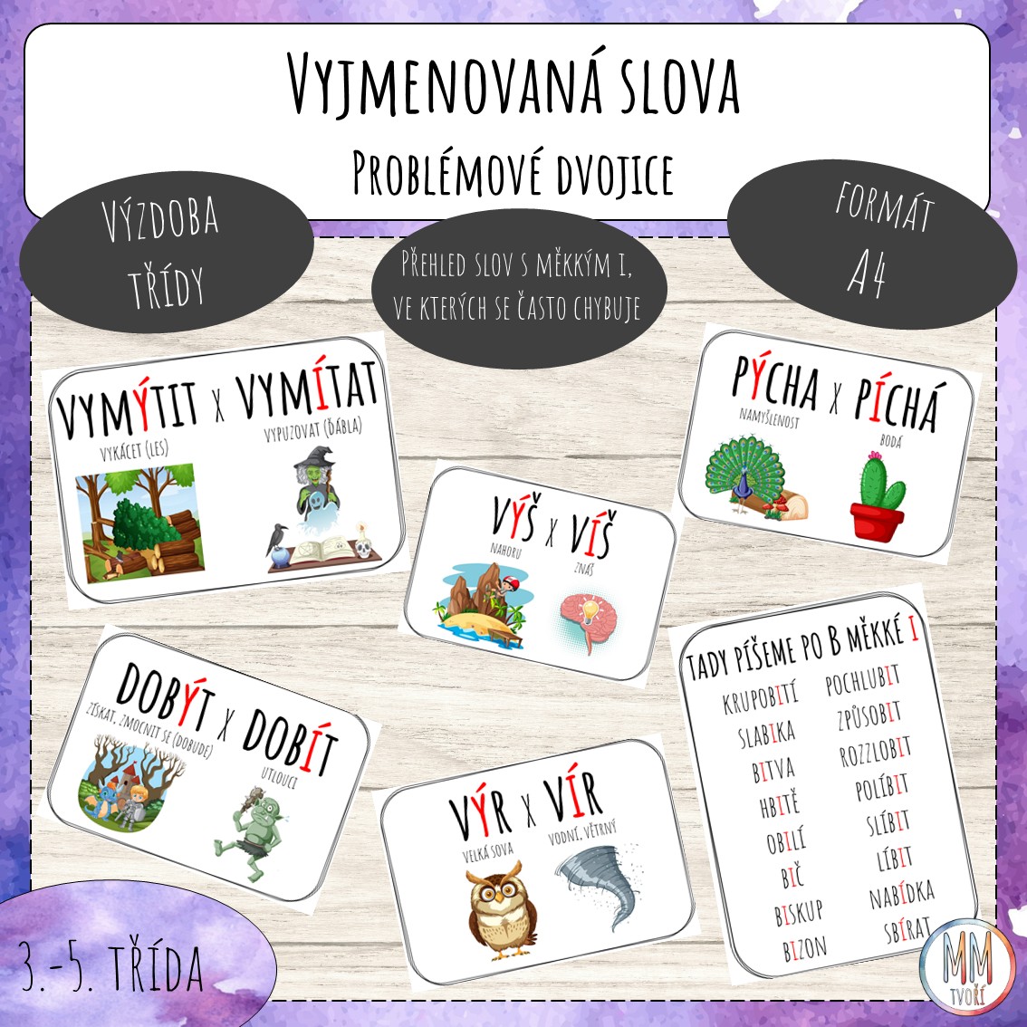 Materiál obsahuje 52 dvojic VS - chytáků, které dětem dávají doslova zabrat. Plakáty ve velikosti A4 obsahují vysvětlení slova doplněné obrázkem pro lepší zapamatování. Je zde také soubor se slovy s měkkým i, kde děti často chybují. Plakáty jsou určeny ke každodennímu použití. Jsou vytvořeny jednoduše a vyzkoušeny přímo v praxi, děti je milují a především si opravdu propojí dané slovo s obrázkem a významem. Společně jsme také vytvořili seznam slov, ve kterých žáci často chybovali, pokud by vám chyběla některá slova, ráda seznamy aktualizuji.