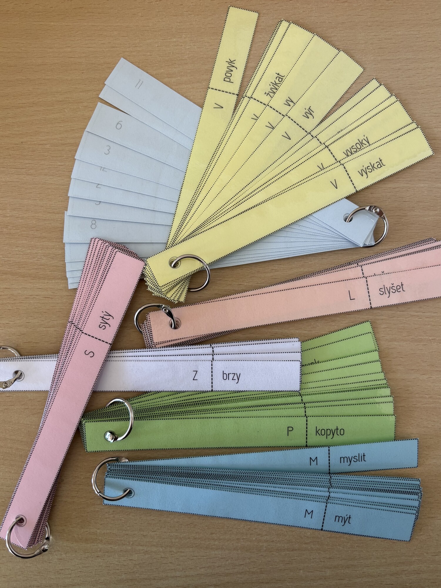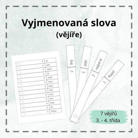 Listy 2-15 vytiskneme oboustranně s překlápěním po delší straně. Zalaminujeme je, rozstříháme na proužky. Proužky na vyznačeném místě proděravíme a dáme je v náhodném pořadí na sebe (každou skupinu vyjmenovaných slov zvlášť, vznikne 7 hromádek). Proužky navlečeme např. na kroužek, nýtek. Žák slova na proužcích skládá do správného pořadí. Až je hotov, vzniklý vějíř otočí a zkontroluje podle čísel (správného pořadí) svou práci.