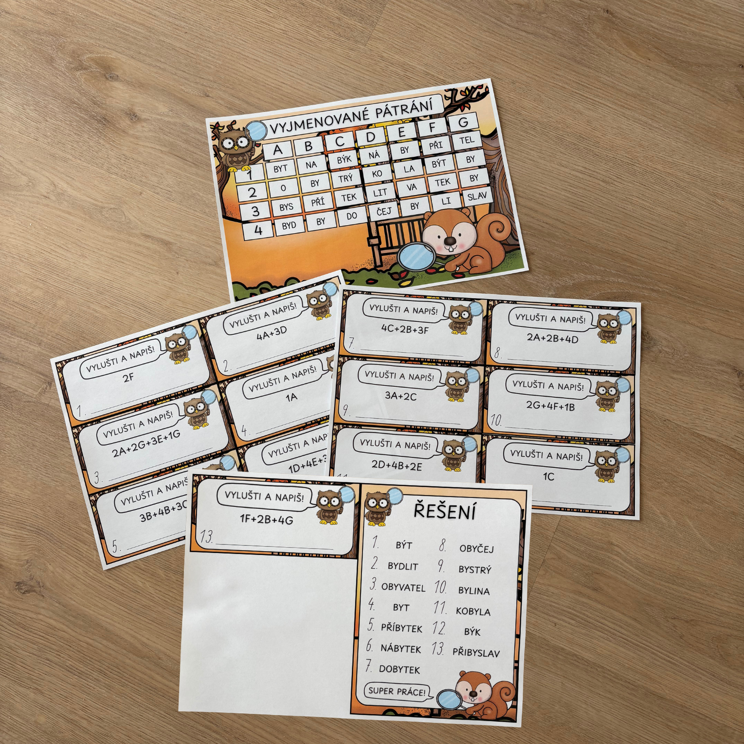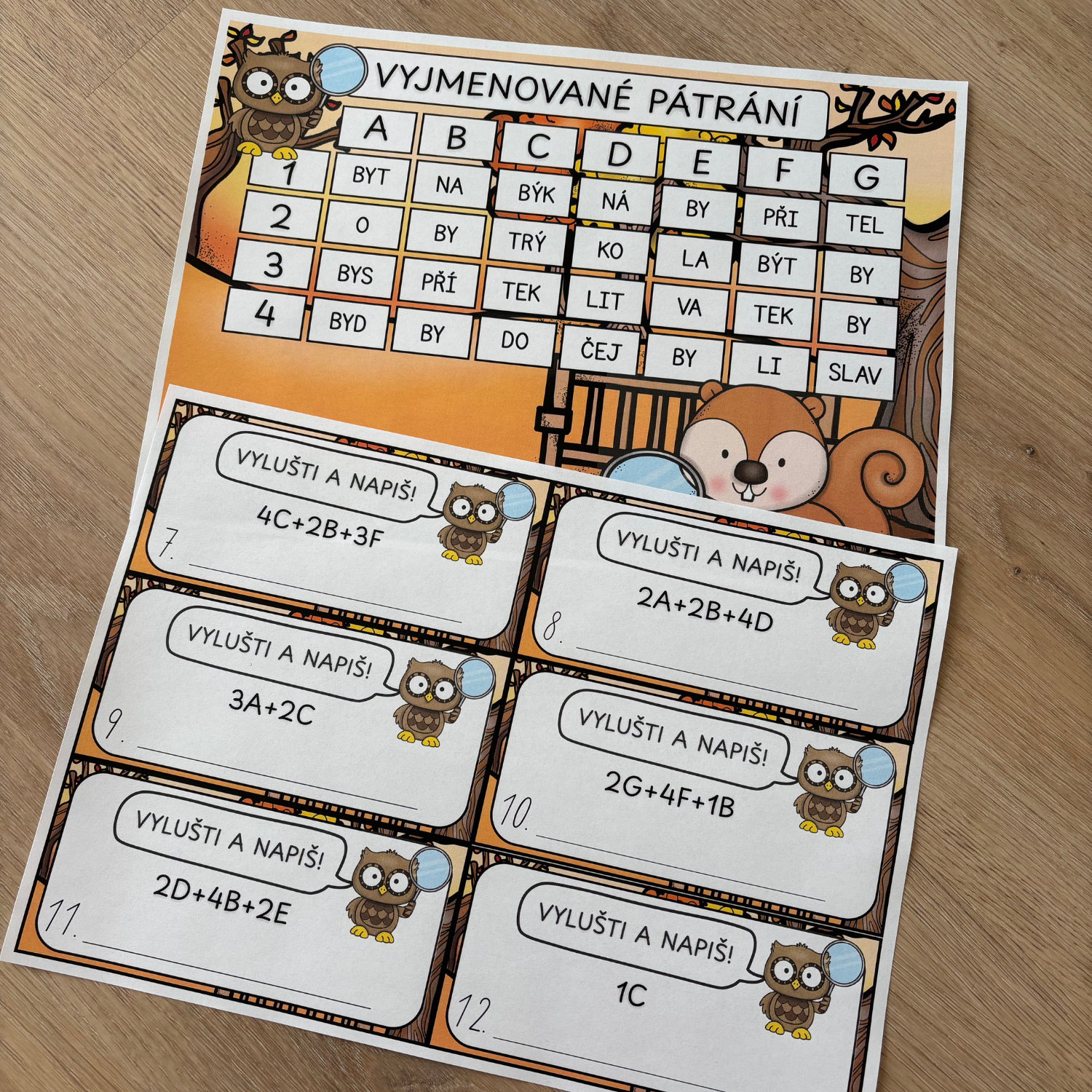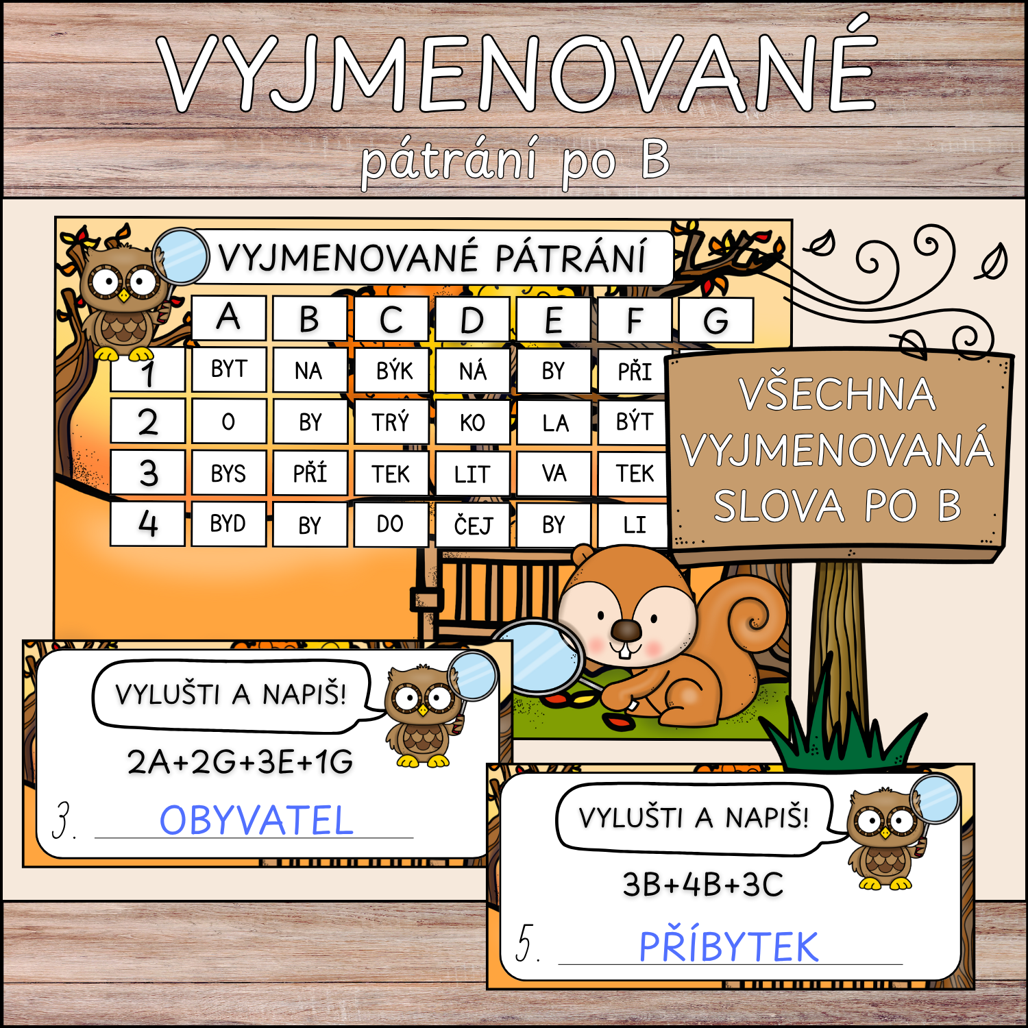 Materiál obsahuje aktivitu „Vyjmenované pátrání po B“, díky které si žáci hravou formou procvičí vyjmenovaná slova po B. Součástí materiálu je luštící karta se slabikami, sada kartiček s kódy k luštění a karta s řešením. Vše je k dispozici v barevné i černobílé variantě.