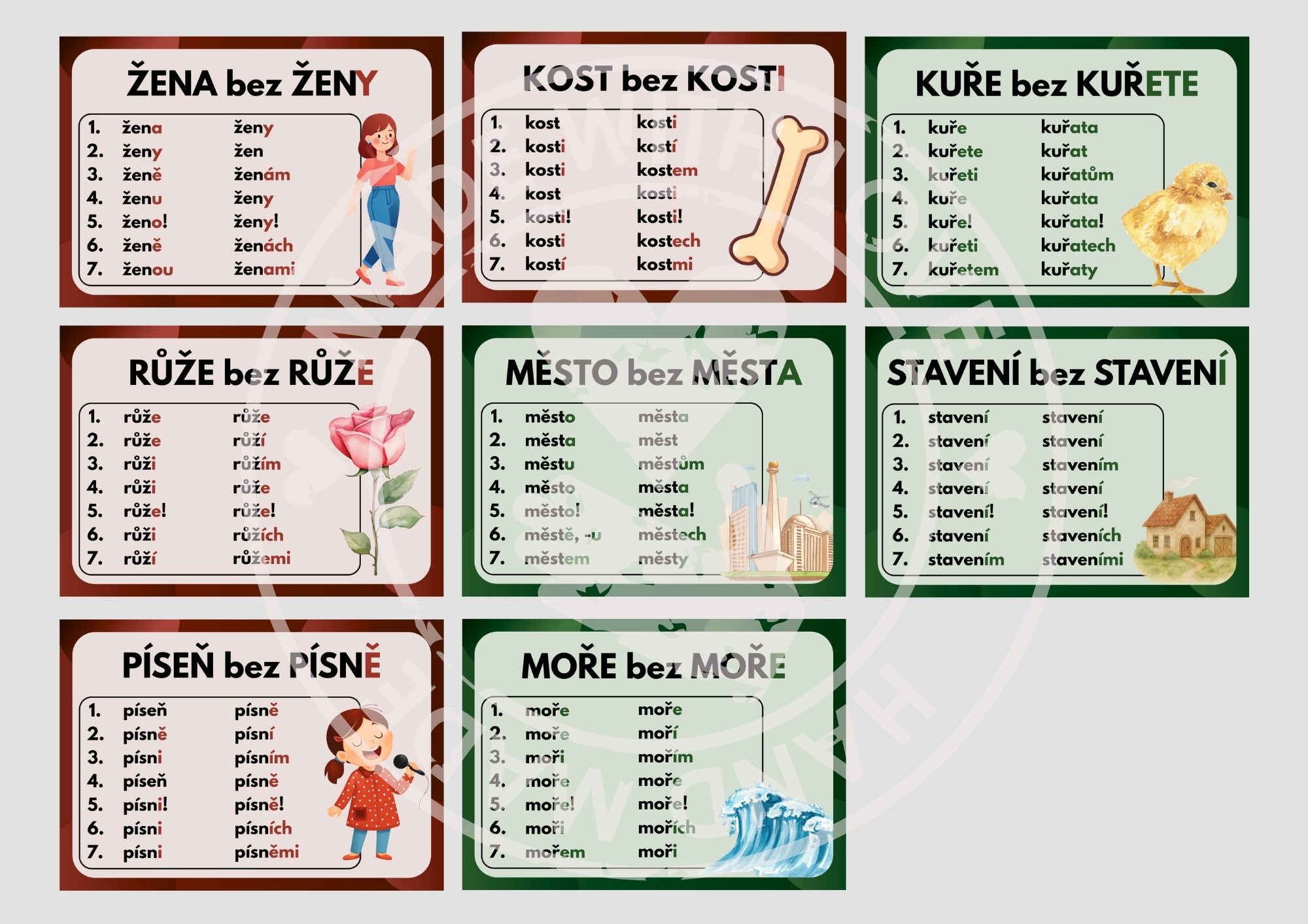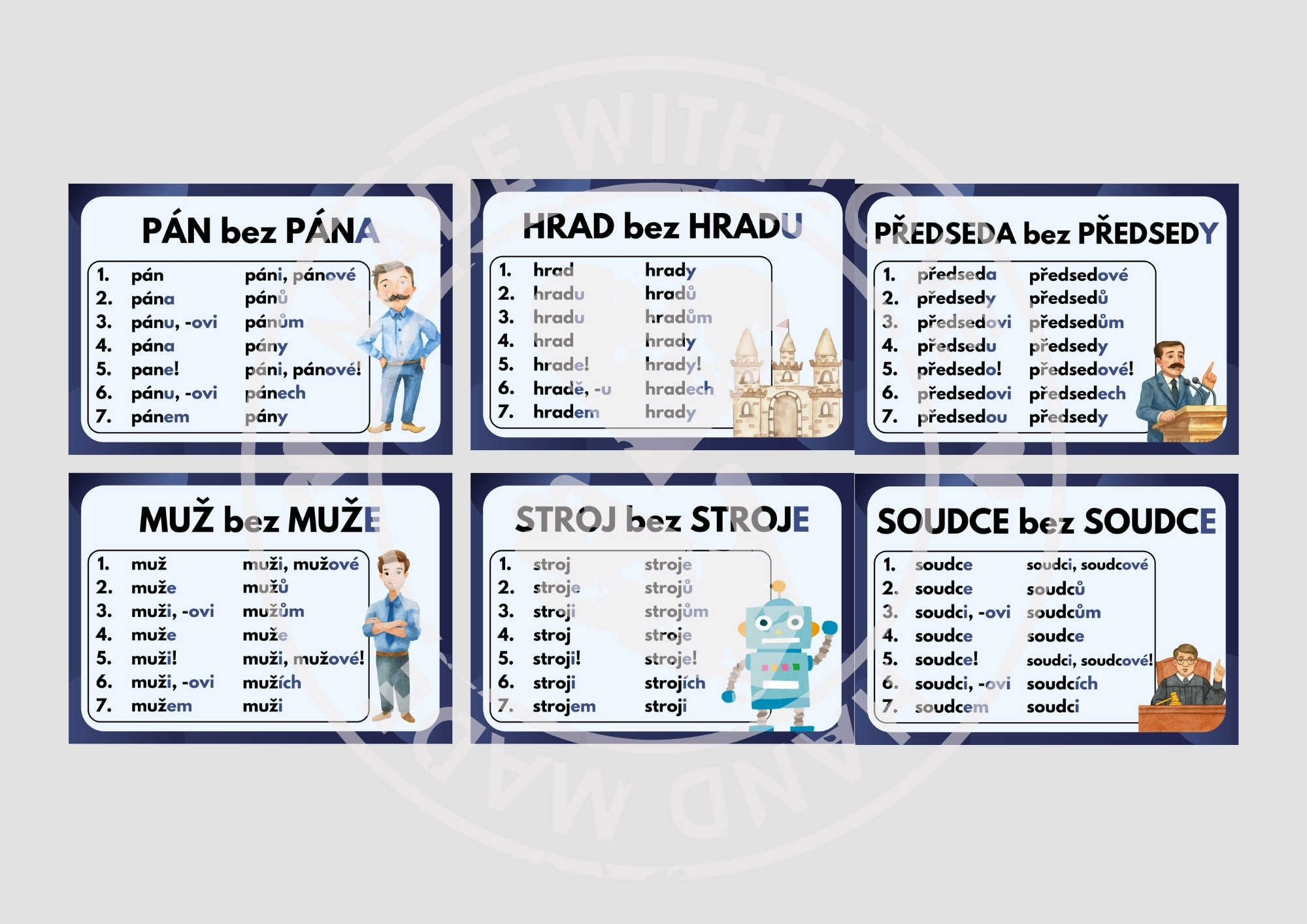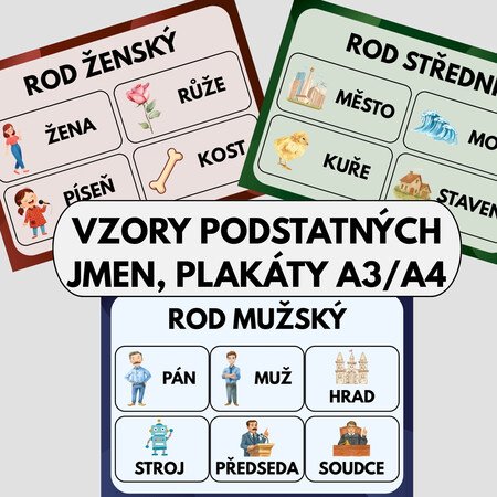 Plakáty se VZORY PODSTATNÝCH JMEN velikosti A3 i A4, které jsou vhodné k použití na výzdobu třídy na prvním stupni základní školy.