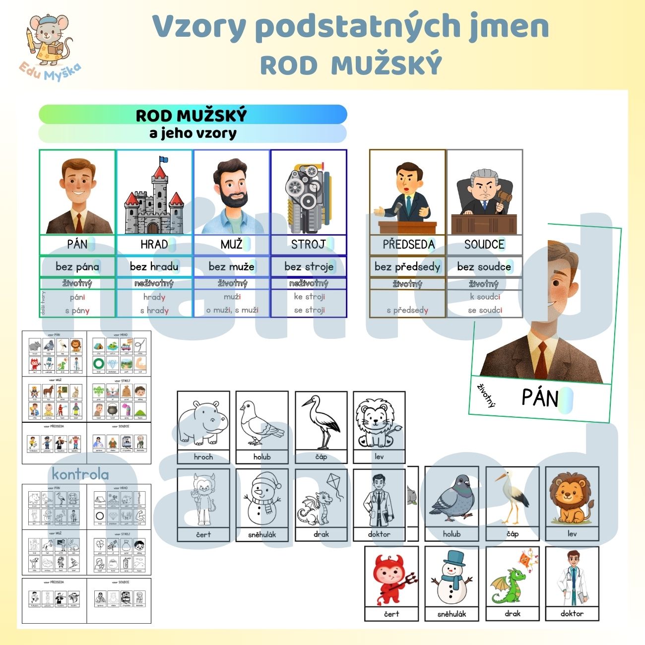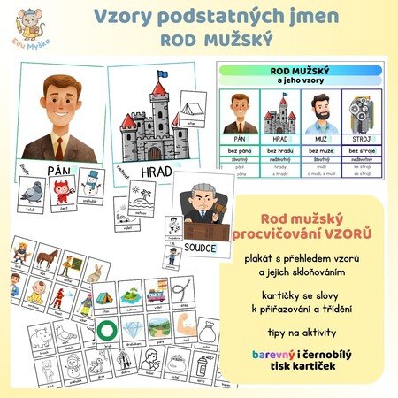 - kartičky se slovy v rodě mužském, které slouží k přiřazování ke správnému vzoru