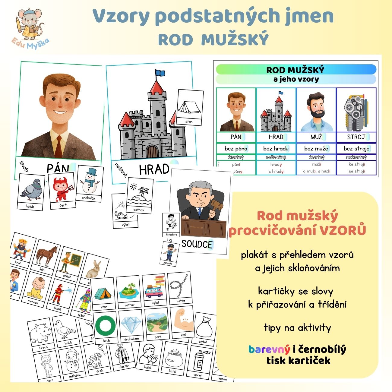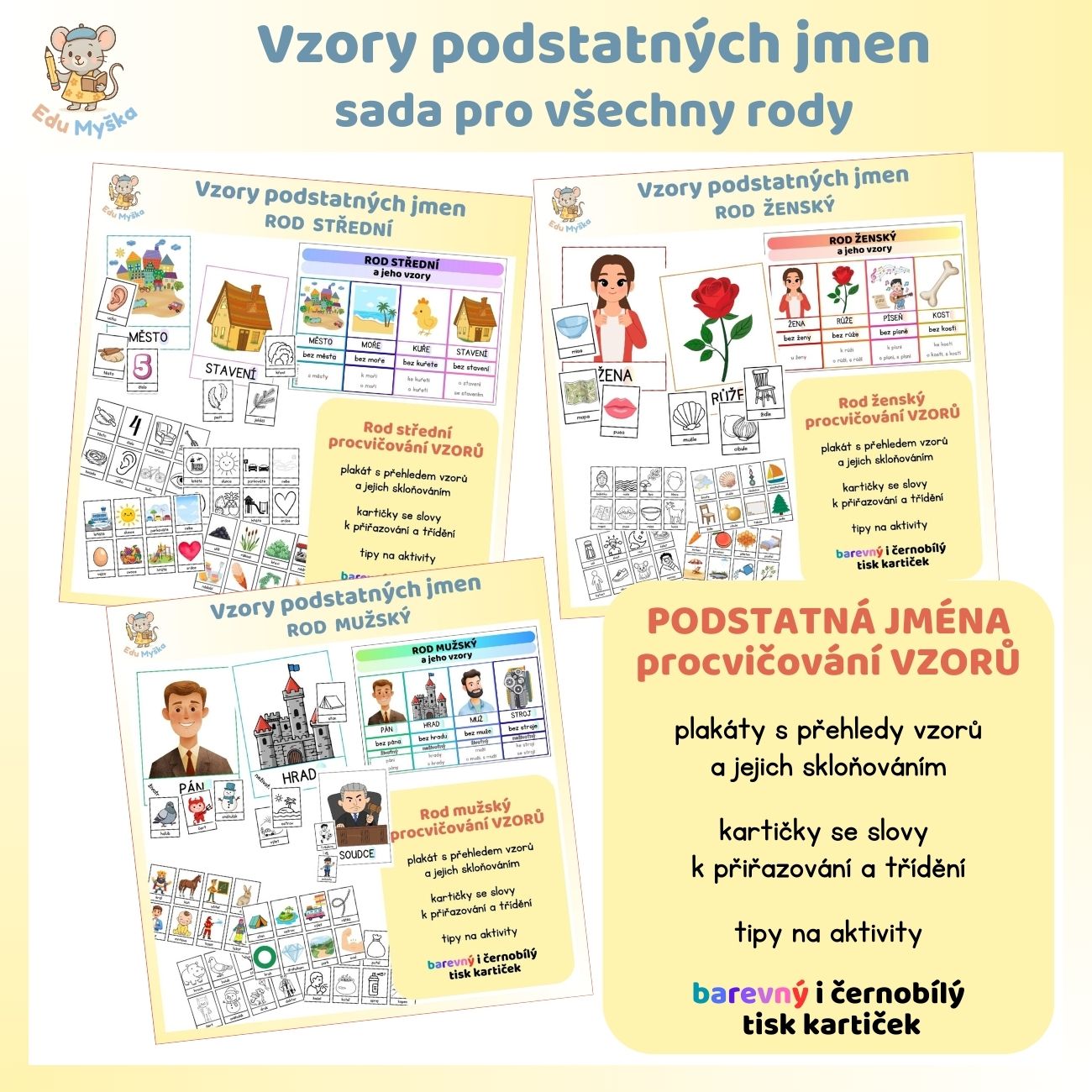 - úvodní přehledy vzorů podstatných jmen rodu středního, ženského i mužského