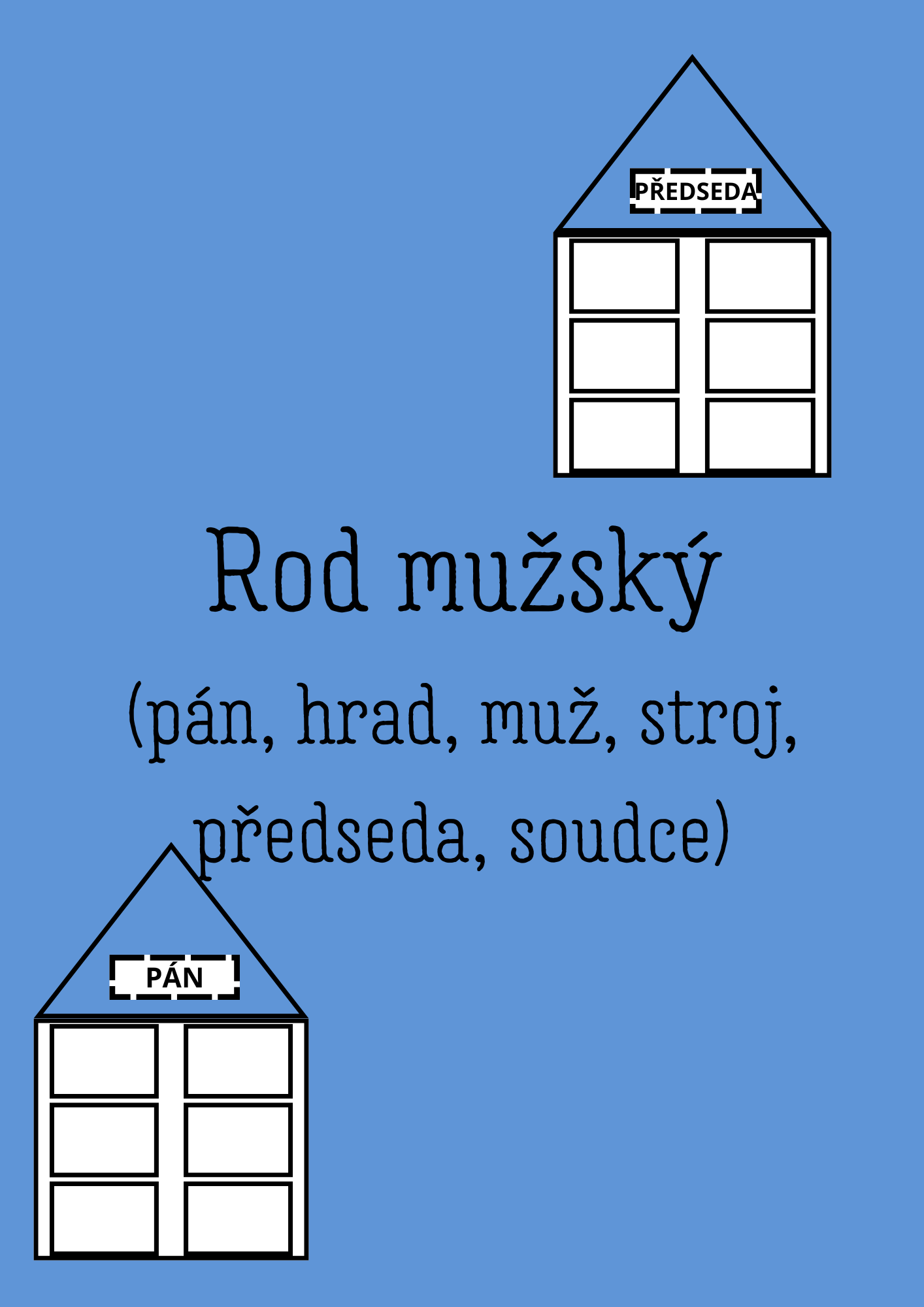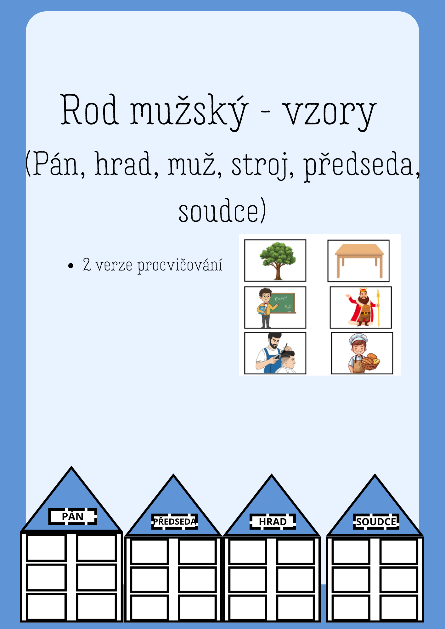 Jedná se o určování vzorů rodu mužského. Soubor obsahuje kartičky se slovy a kartičky s obrázky, které lze přiřazovat do jednotlivých domečků.