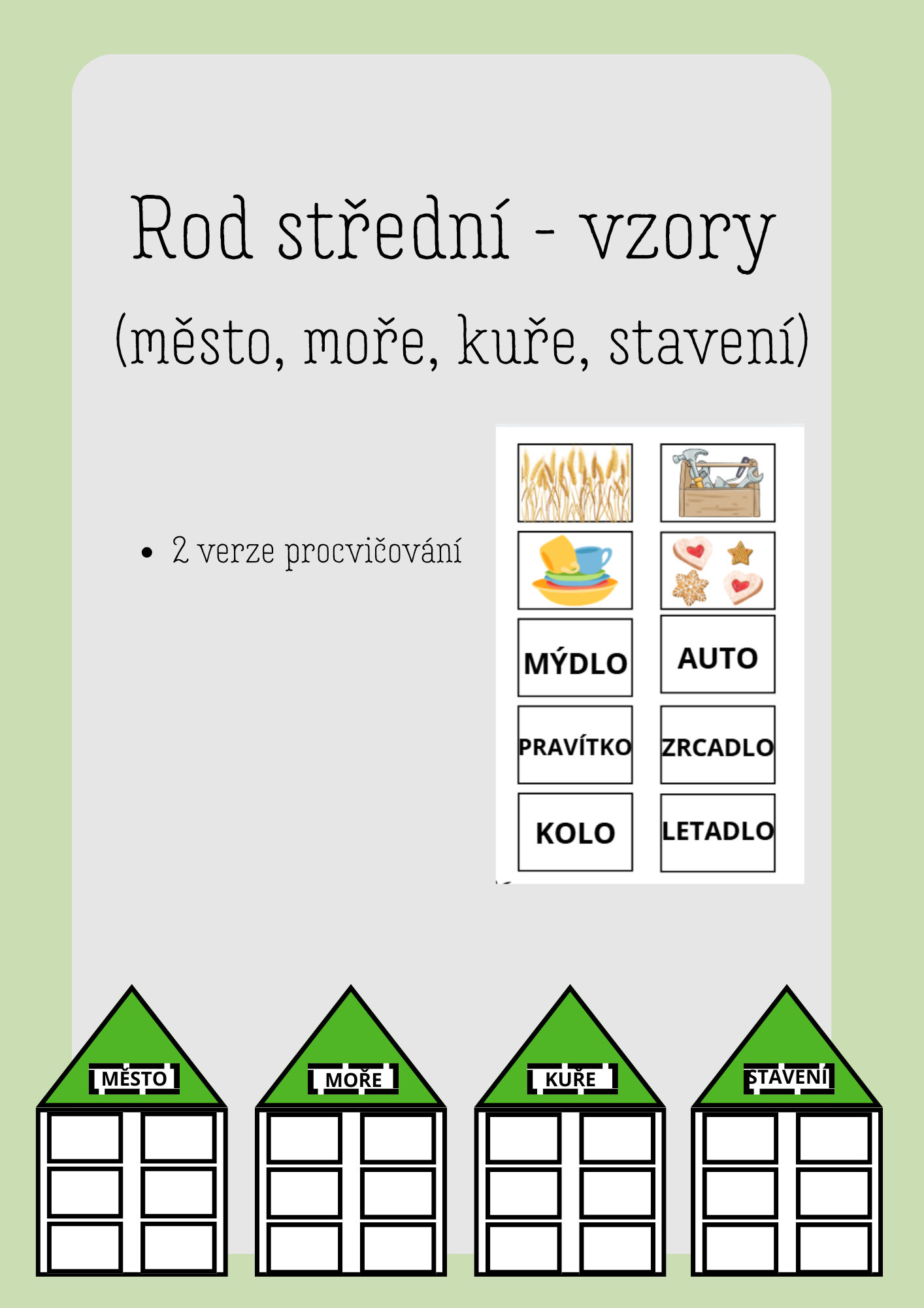Jedná se o určování vzorů rodu středního. Soubor obsahuje kartičky se slovy a kartičky s obrázky, které lze přiřazovat do jednotlivých domečků.