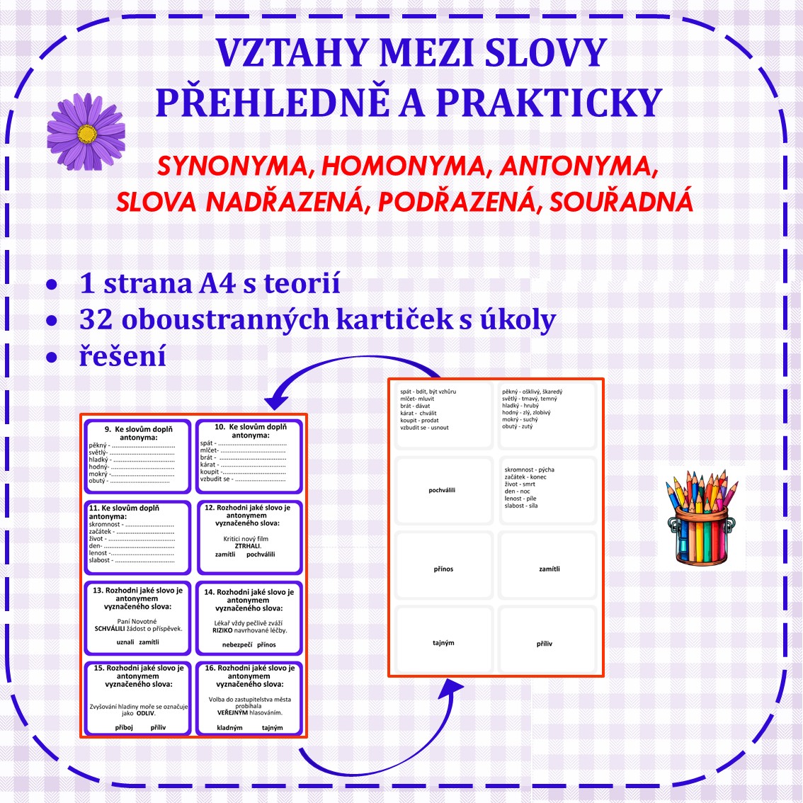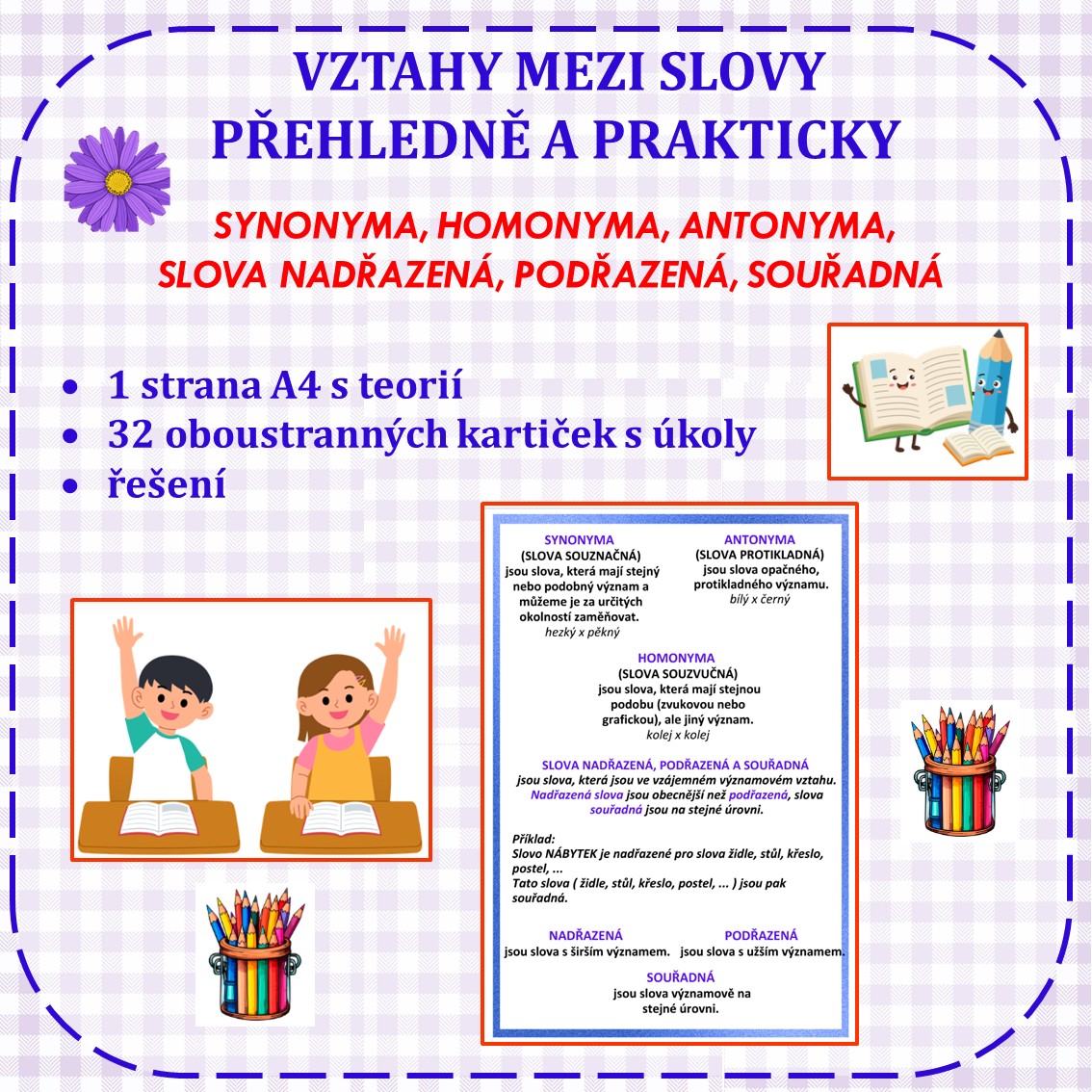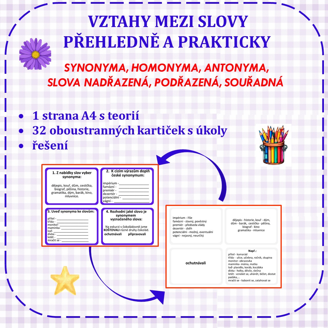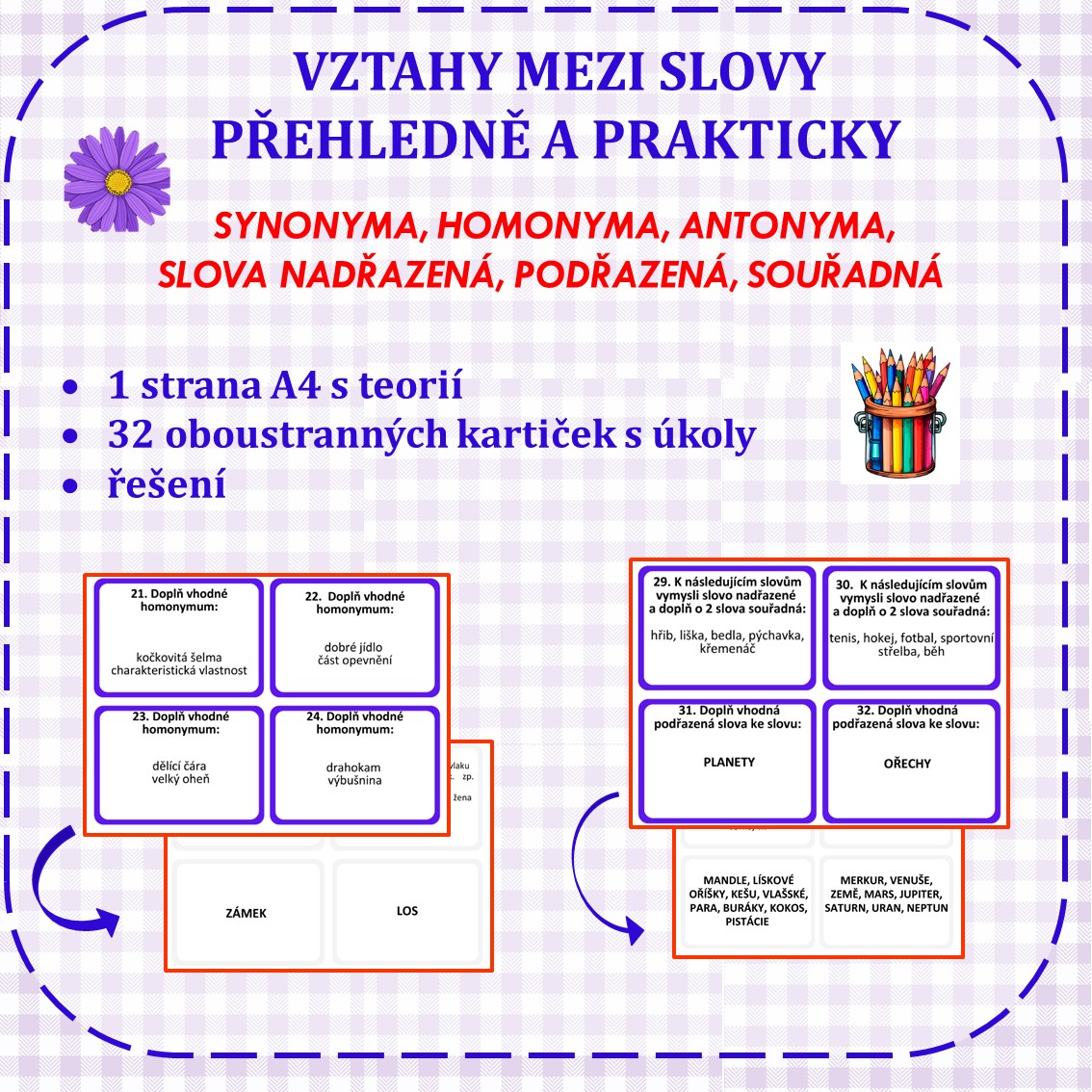 Materiál j slouží k procvičování synonym, homonym, antonym a slov nadřazených, podřazených a souřadných. Obsahuje 1 stranu přehledné teorie a 32 oboustranných karet s řešením, které lze využít při výuce, samostatné práci i sebekontrole žáků.