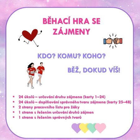Běhací hra zaměřená na procvičování druhů zájmen a správného tvarosloví. 48 úkolů (24 určování, 24 doplňování), Pl, řešení a metodický návod.
