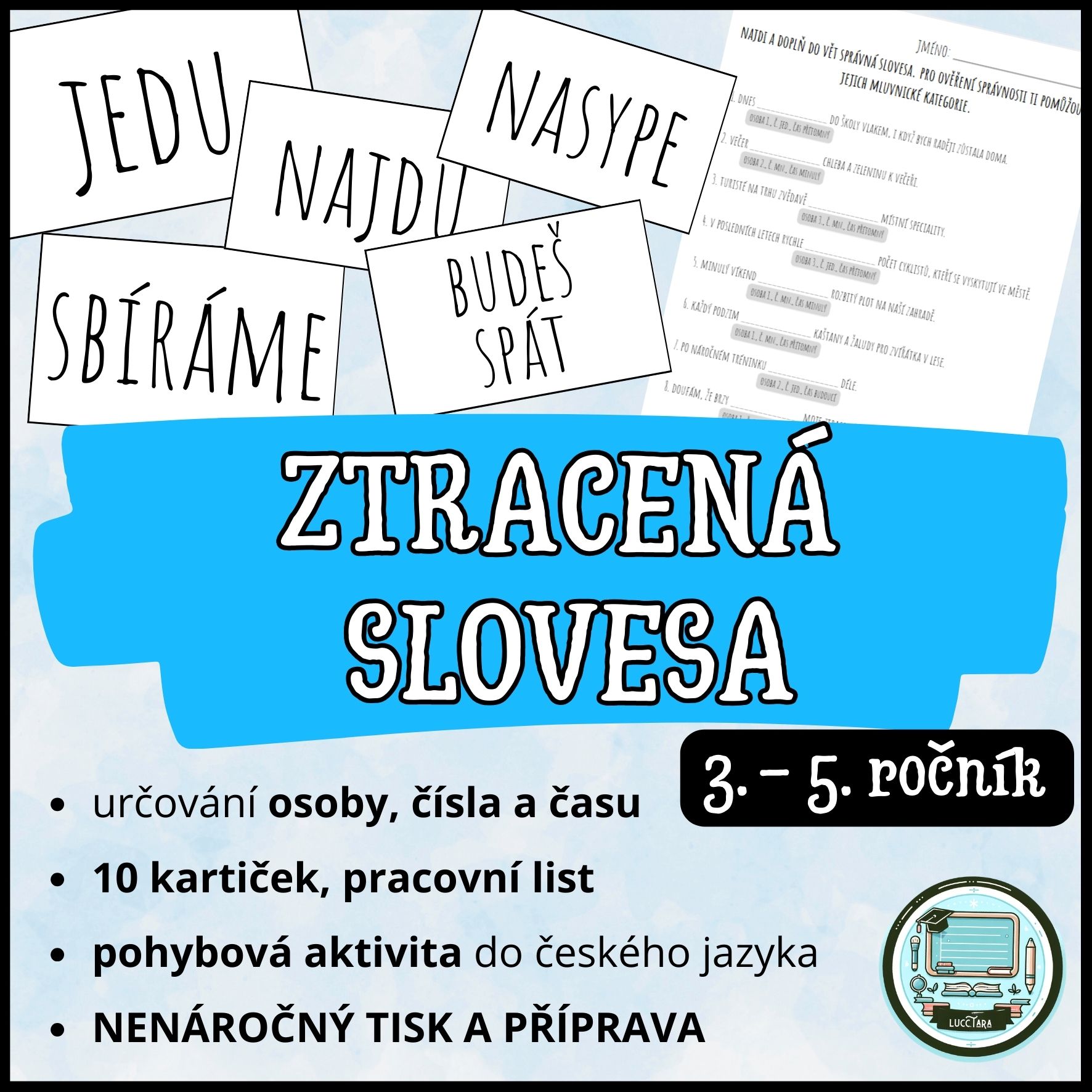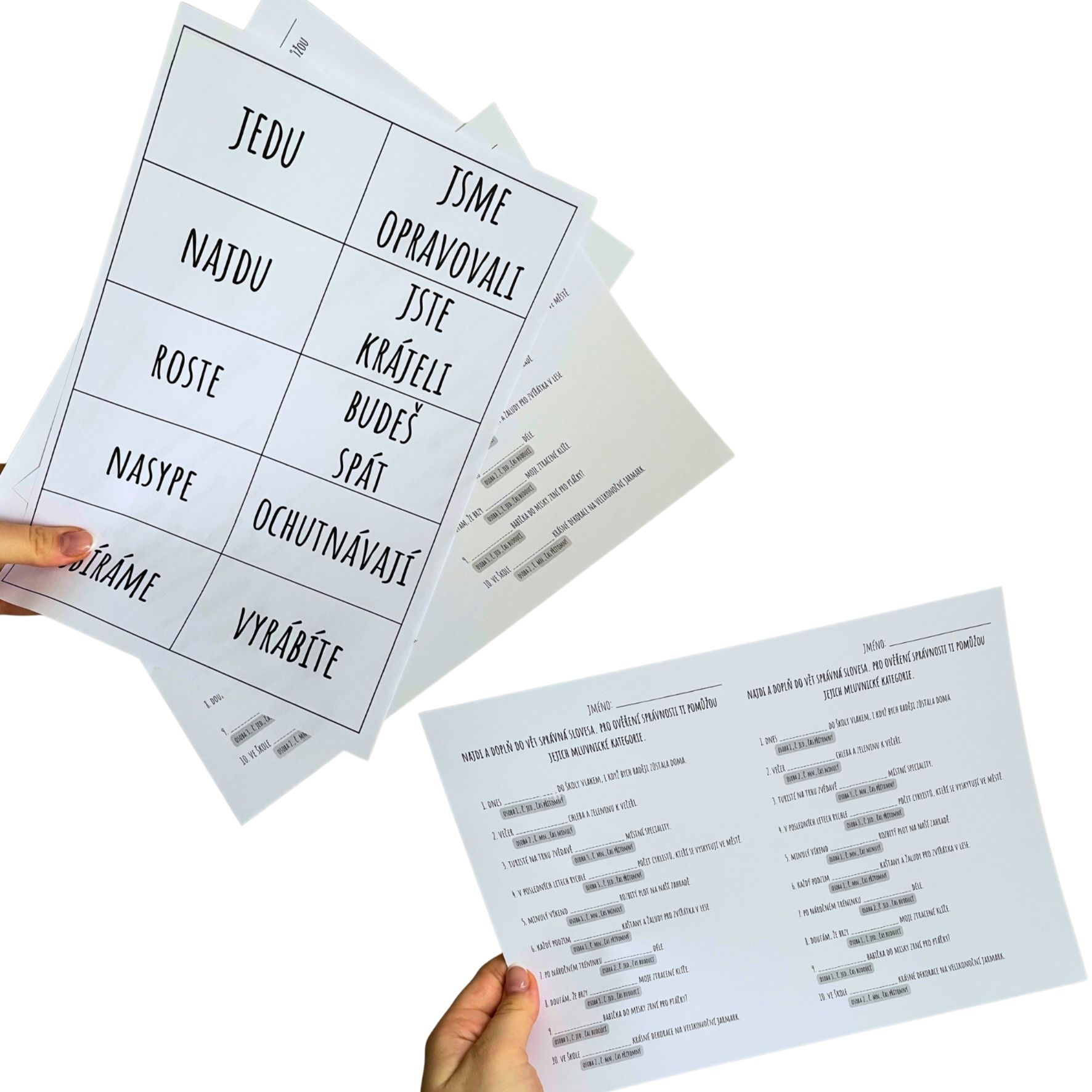 Kartičky rozmístěte ve třídě, na chodbě nebo venku. Žáci hledají slovesa, určují jejich mluvnické kategorie a doplňují je do vět.