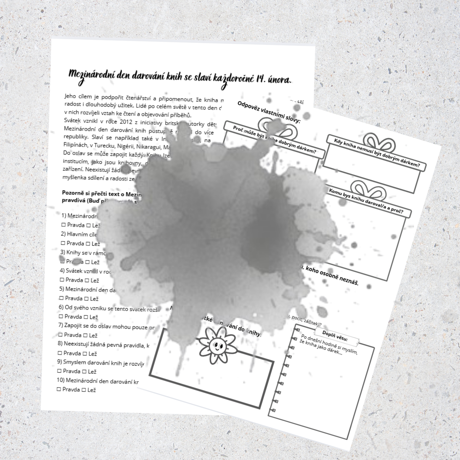 Žáci pracují s informativním textem o méně známém svátku, ověřují porozumění pomocí úlohy pravda × lež, zdůvodňují své odpovědi a přemýšlejí o knize jako dárku, kdy dává smysl a kdy naopak ne. Součástí je také krátké psaní (věnování do knihy) a závěrečná reflexe.