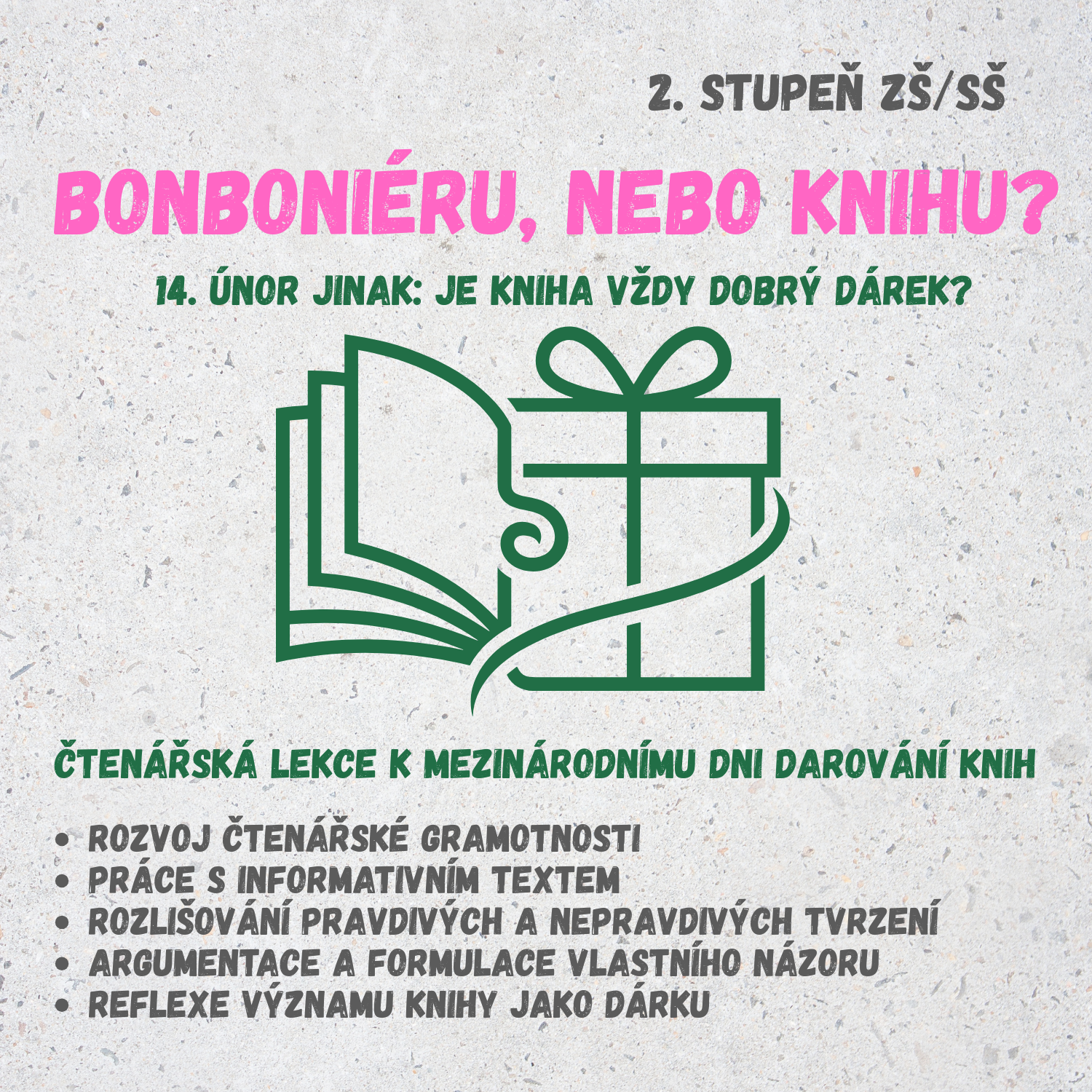 Diskuzní pracovní list určený pro 2. stupeň ZŠ a SŠ, tematicky zaměřený na Mezinárodní den darování knih (14. února). Materiál nabízí alternativu k tradičním valentýnským aktivitám a rozvíjí čtenářskou gramotnost, kritické čtení a argumentaci.