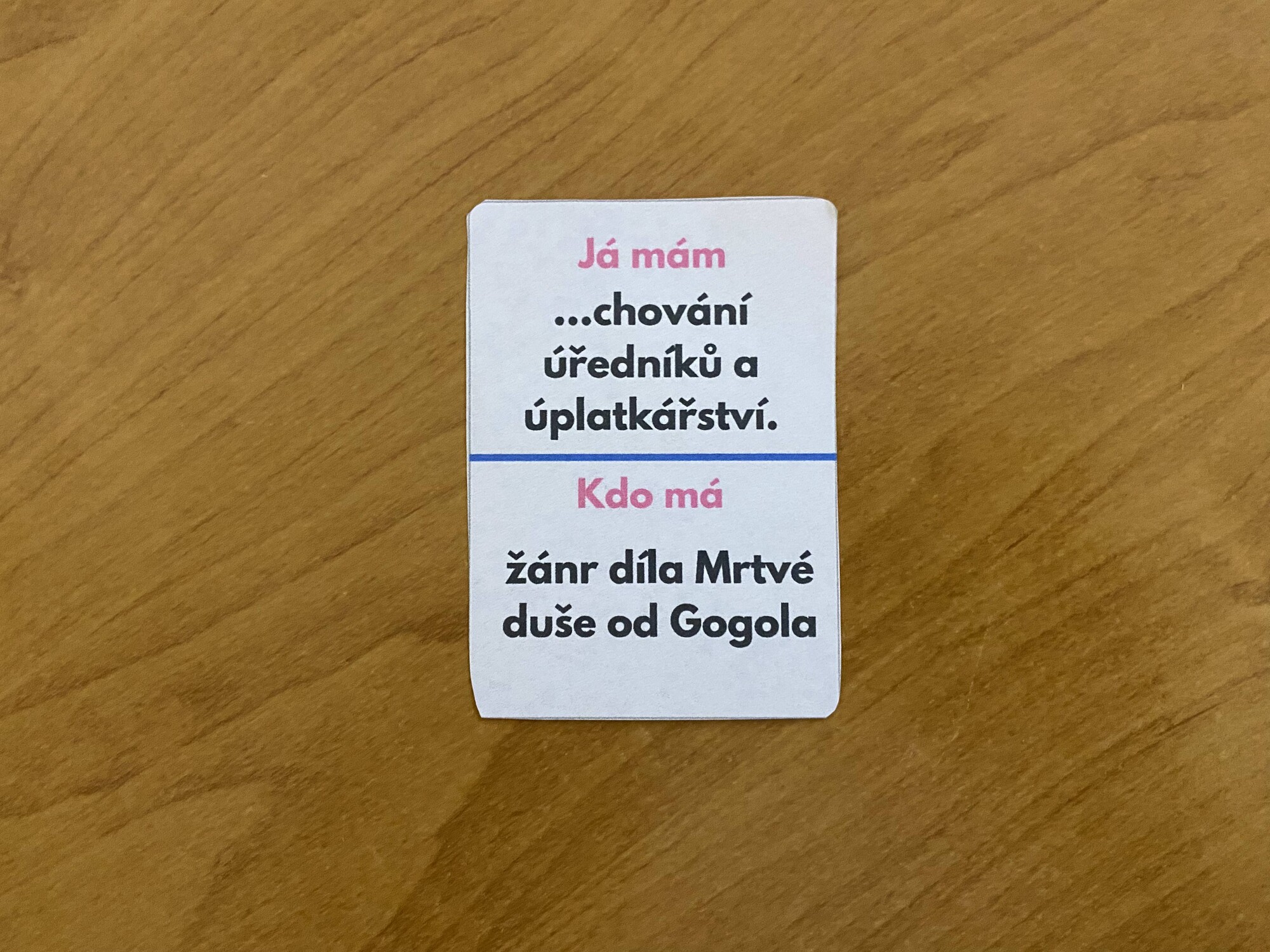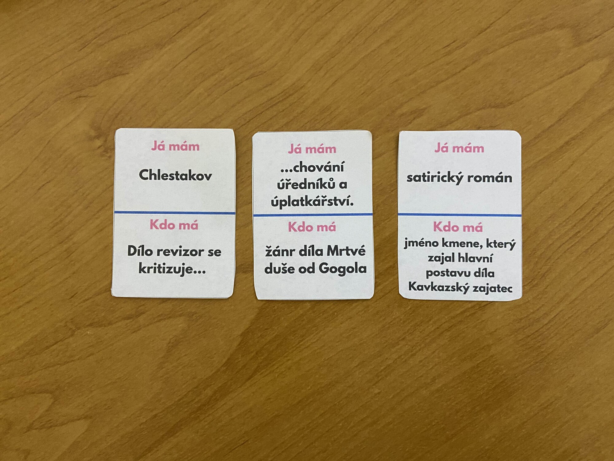 - Vyučující rozdá každému žákovi jednu náhodnou kartičku a nechá si počáteční a koncovou. Učitel začne a zeptá se „kdo má...?" Kdo má věc, která pasuje k této otázce, řekne „já mám...", a poté na své kartičce přečte také „kdo má...?"