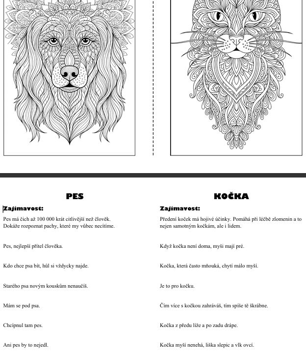 V dokumentu pojmenovaném Mandaly najdete osm obrázků zvířat zmíněných v názvu. Dokument je upravený tak, že na jedné straně A4 jsou dvě zvířata. Mandala na celý list A4 by byla příliš pracná na kreslení, proto je tisk přizpůsoben takto. Zároveň na listu najdete ořezovou značku, která vám pomůže obrázky rozstříhnout uprostřed.