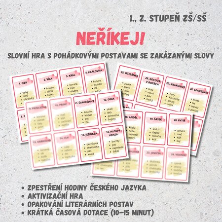 Materiál NEŘÍKEJ! – Slovní hra s pohádkovými postavami se zakázanými slovy obsahuje 30 karet určených pro 1.–2. stupeň ZŠ a SŠ. Každá karta představuje známou klasickou nebo českou pohádkovou postavu a čtyři zakázaná slova, která při vysvětlování nelze použít.