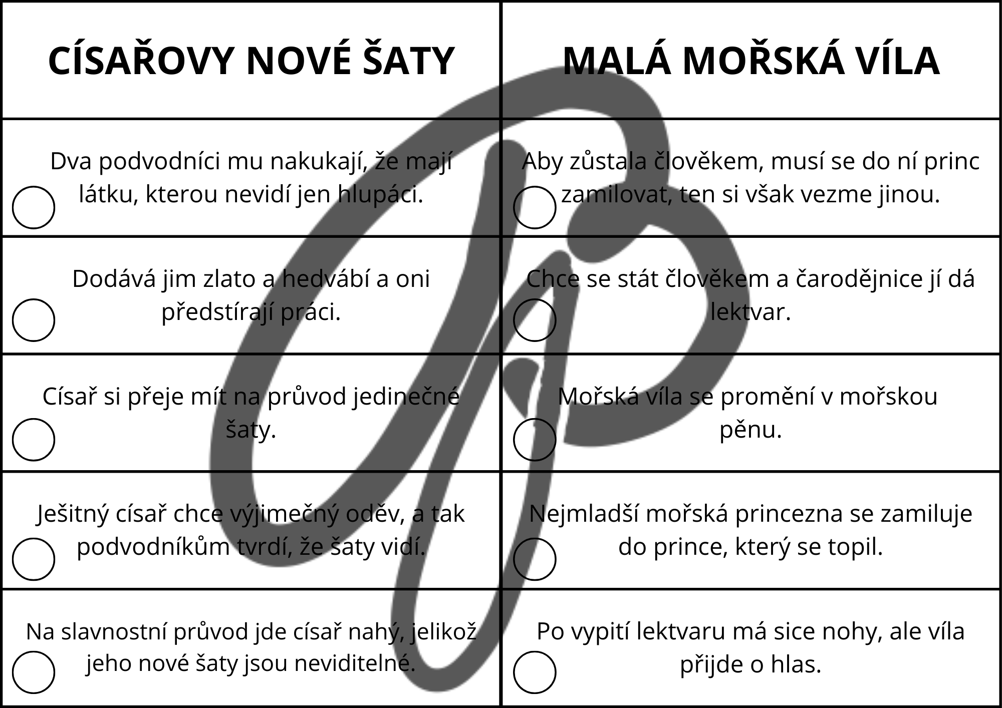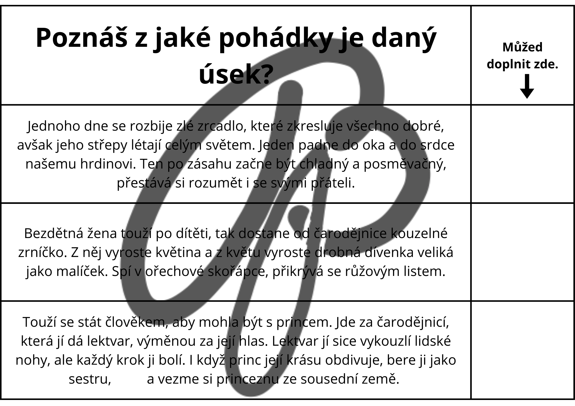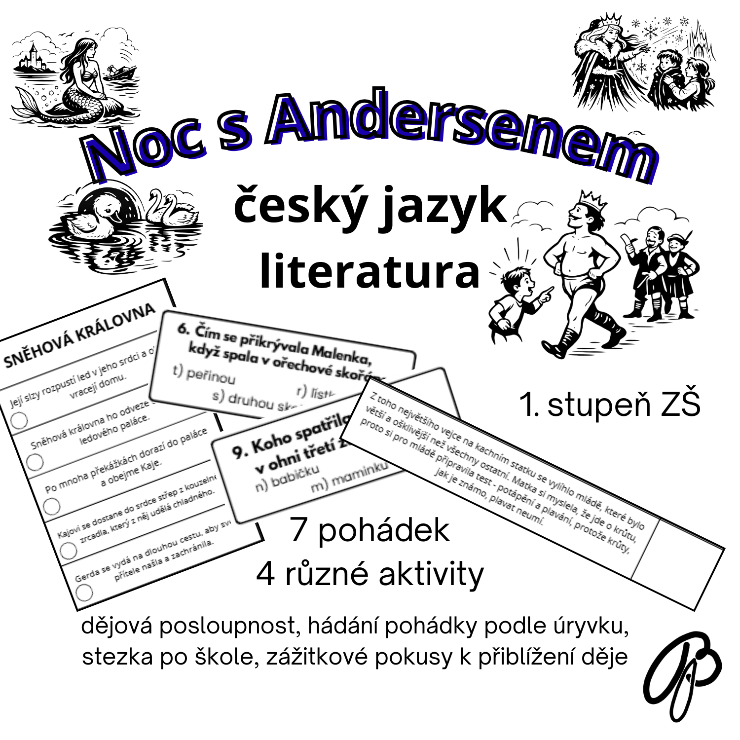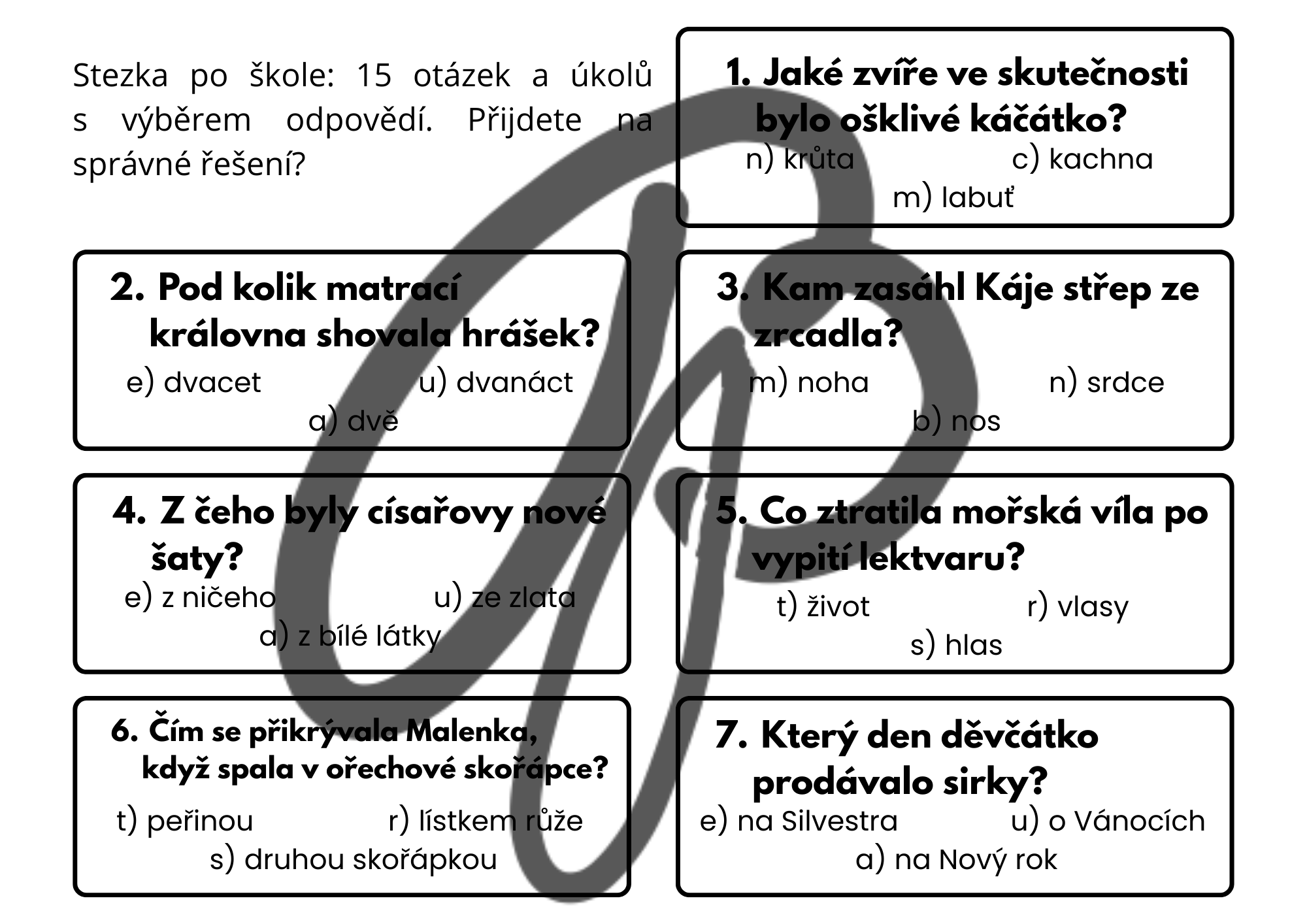 Děti pracují se sedmi známými pohádkami (Malá mořská víla, Sněhová královna, Malenka, Princezna na hrášku, Ošklivé kačátko, Císařovy nové šaty a Děvčátko se sirkami). Řadí věty podle dějové posloupnosti, poznávají příběhy podle úryvků a plní tematickou stezku po škole s tajenkou. Aktivity rozvíjejí čtenářskou gramotnost, porozumění textu i spolupráci ve skupině.