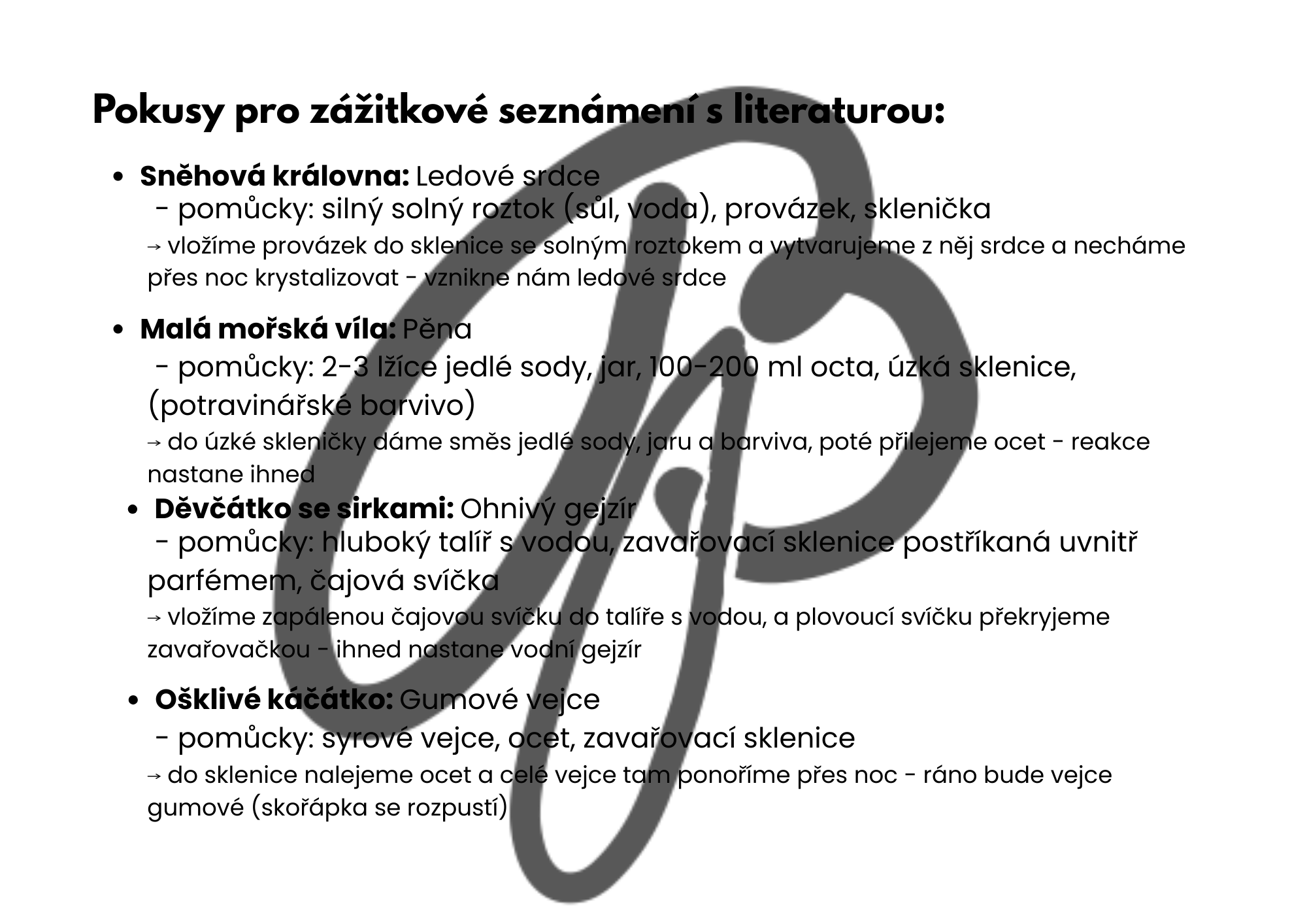 Součástí jsou také jednoduché pokusy inspirované pohádkami (např. ledové srdce, pěnová reakce nebo gumové vejce), díky nimž si děti některé motivy samy vyzkouší. Materiál je vhodný pro 1.–5. ročník ZŠ