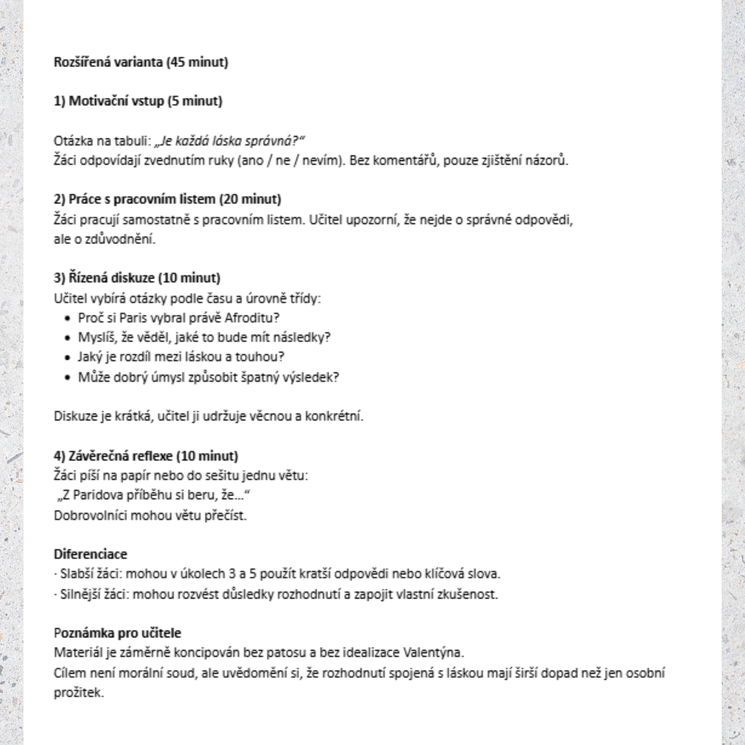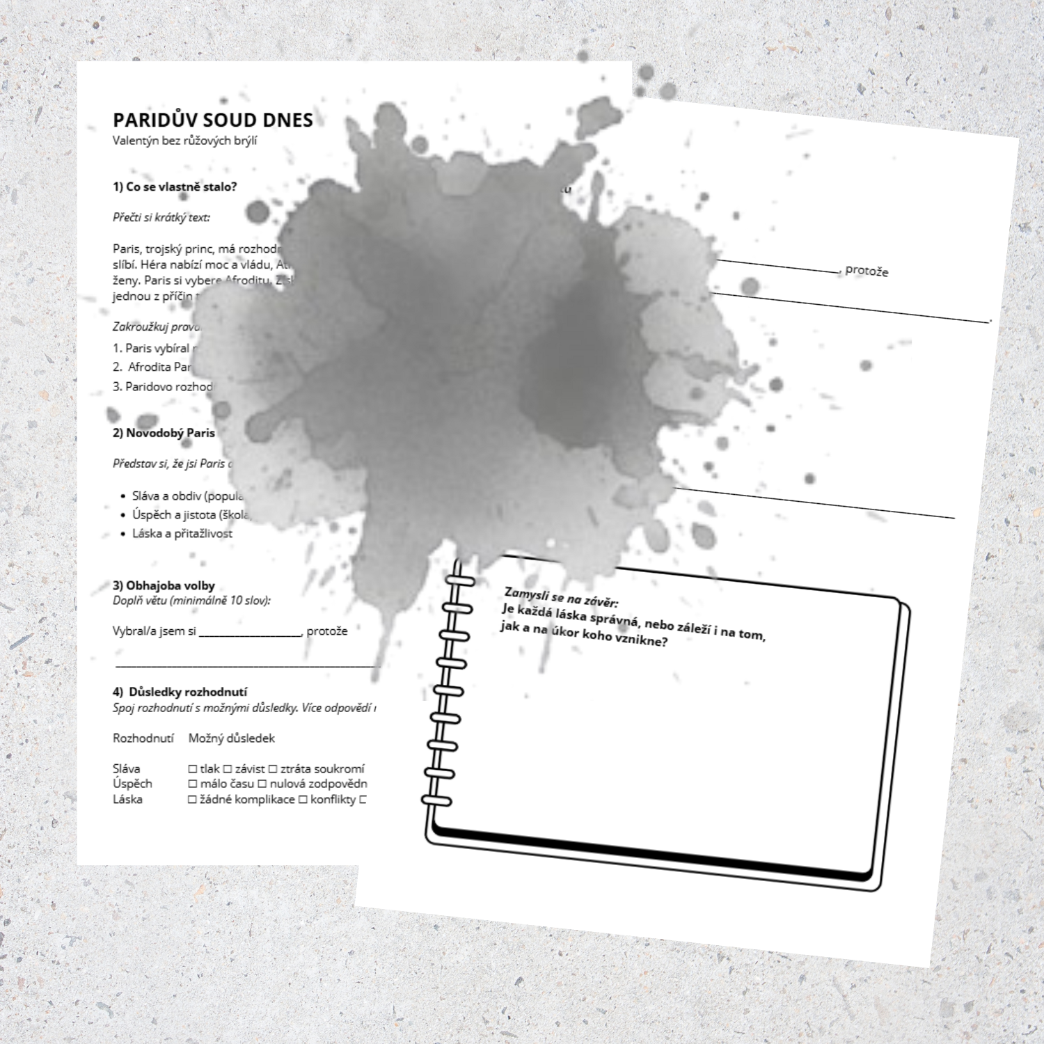 Literární aktivita inspirovaná mýtem o Paridově soudu, vhodná k tematickému využití kolem Valentýna. Žáci se seznámí se základním dějem mýtu, pochopí Paridovu volbu a její důsledky a následně přenesou situaci do současnosti. V roli „novodobého Parida“ volí mezi slávou, úspěchem a láskou, svou volbu zdůvodní a zamyslí se nad tím, jaké může mít rozhodnutí následky.