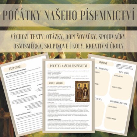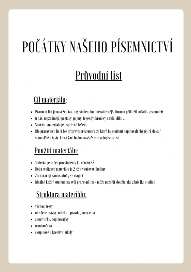 Pracovní list je navržen tak, aby studentům interaktivnější formou přiblížil počátky písemnictví u nás, nejznámější postavy, pojmy, legendy, kroniky a další díla, ... Součástí materiálu je i správné řešení.