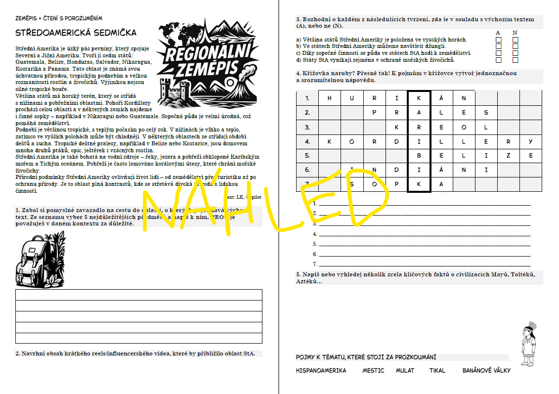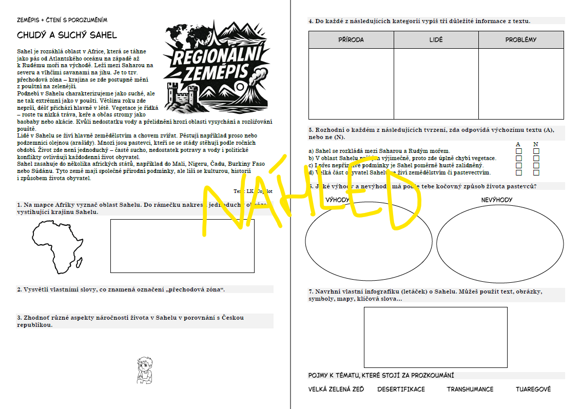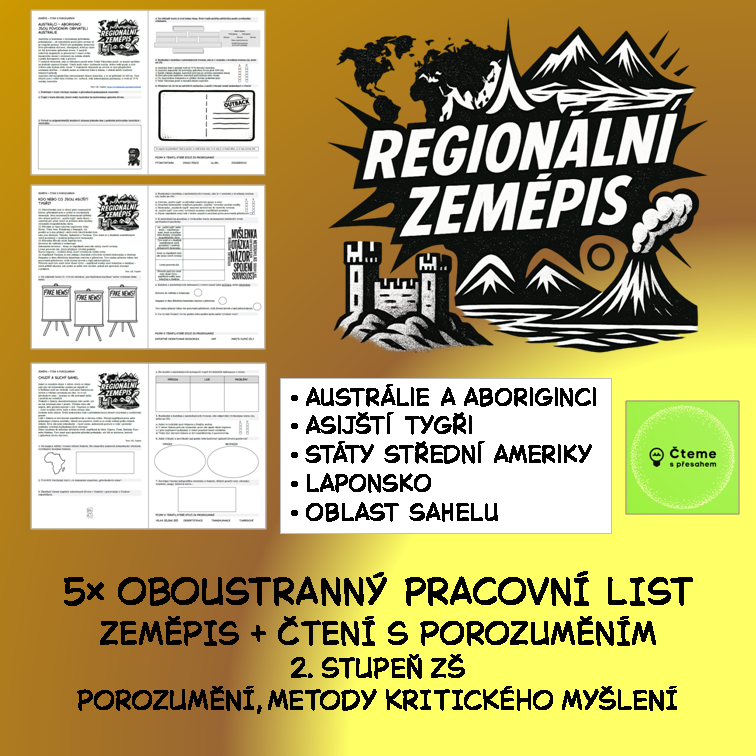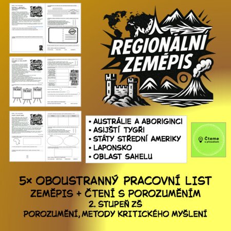 Obsahem materiálu je 5 oboustranných pracovních listů, které jsou věnované 5 světových regionům: australským pustinám a jejich původním obyvatelům, středoamerickým státům, tzv. asijským tygrům, Laponsku a oblasti Sahelu. Na každém pracovním listu najdete zhruba půlstránkový výchozí text o dané oblasti, k němuž se vážou rozmanité úkoly. Tyto úkoly jsou zaměřené na porozumění textu, využívají různé čtenářské strategie a různé metody kritického myšlení, ale také žáky podporují v uvažování a různorodém zpracování vlastních myšlenek. Pracovní listy jsou po vytisknutí ihned připraveny k použití. Na každém pracovním listu se také nachází několik dalších pojmů souvisejících s tématem, jejichž význam mohou žáci dohledávat nebo je dále rozpracovat.