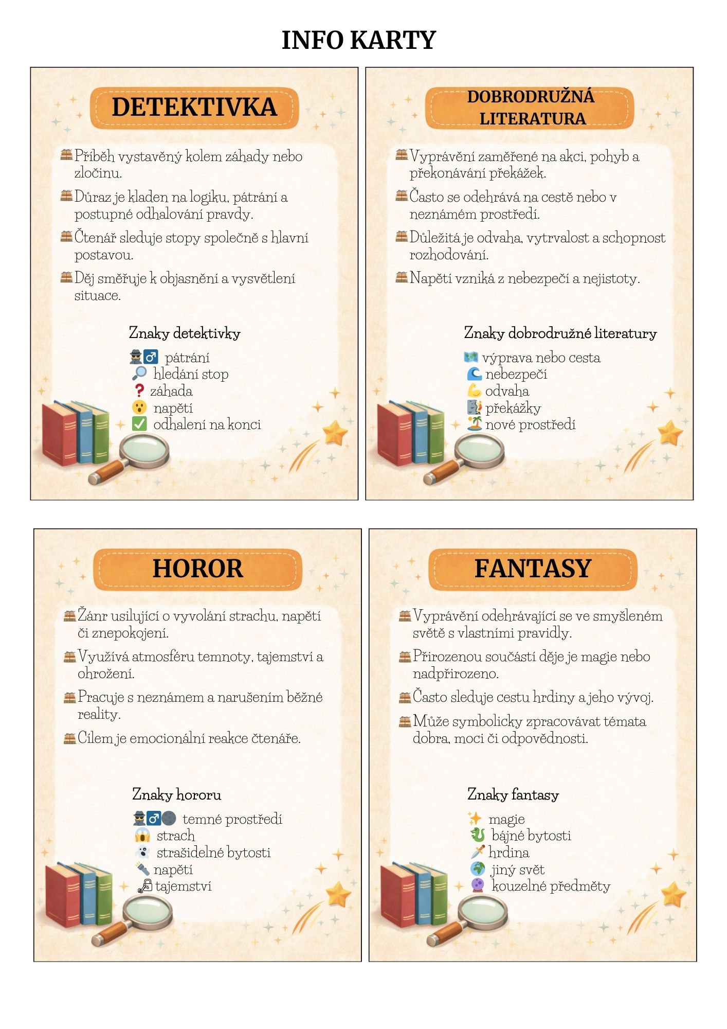 Balíček Žánrohrátky propojuje přehledné vysvětlení, práci s textem i pohybovou aktivitu. Žáci se neučí pouze názvy žánrů, ale učí se je skutečně rozpoznávat podle typických znaků a obhájit své rozhodnutí.