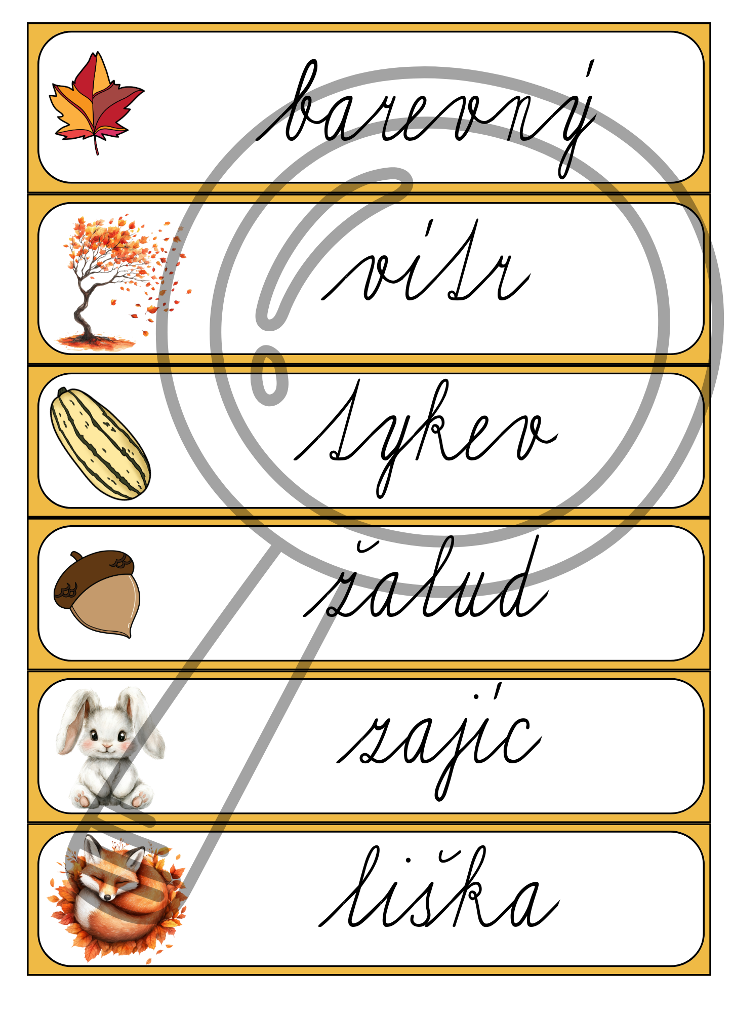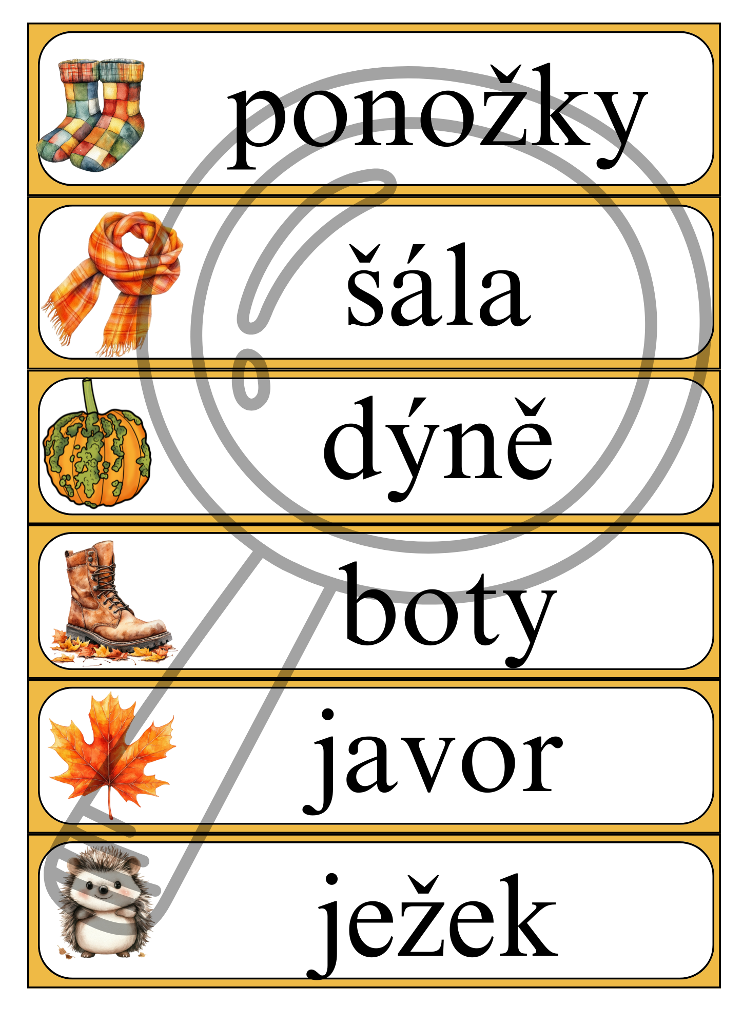 Karty zalaminujte pro opakované použití. Rozstříhané kartičky rozmístěte po třídě. Děti hledají kartičky se slovy a následně je zapisují do pracovního listu dle obrázku. Zkontrolovat mohou dle kontrolního listu
