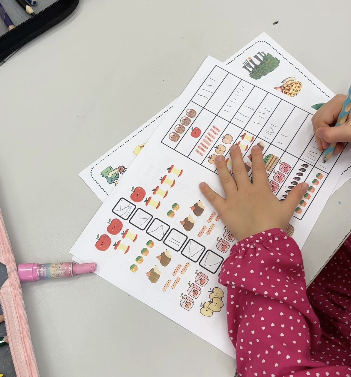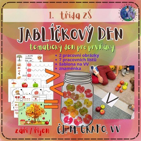 - 7 pracovních listů (M - záznam čísla pomocí čárek, porovnávání, jednoduché názorné sčítání, přiřazování počtu k číslovce, Čj - doplňování písmen, rozvoj slovní zásoby, grafomotorika - uvolňovací cviky)