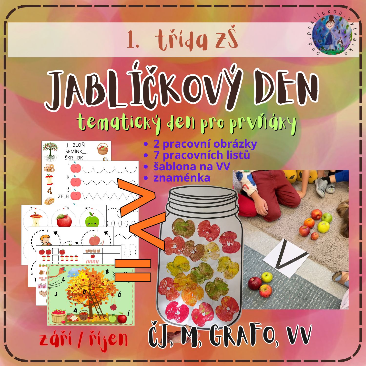 Materiály pro prvňáčky v září/říjnu školního roku. Přiložený průvodni líst obsahuje návod, jak s materiálem pracovat + další tipy do výuky.