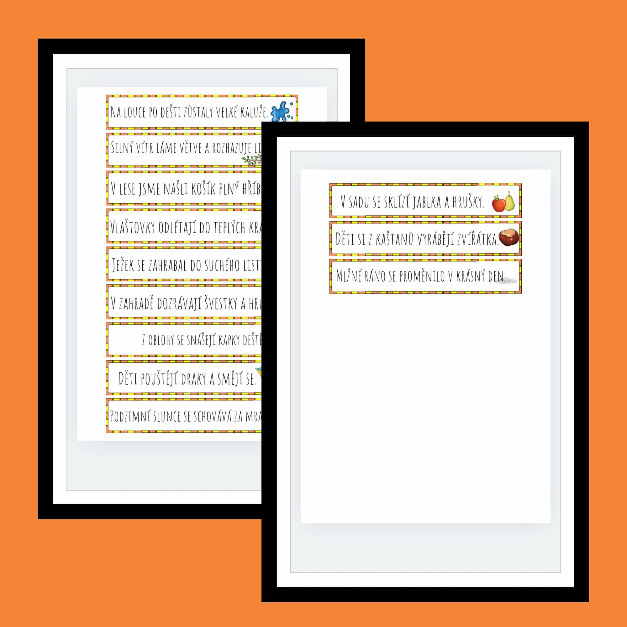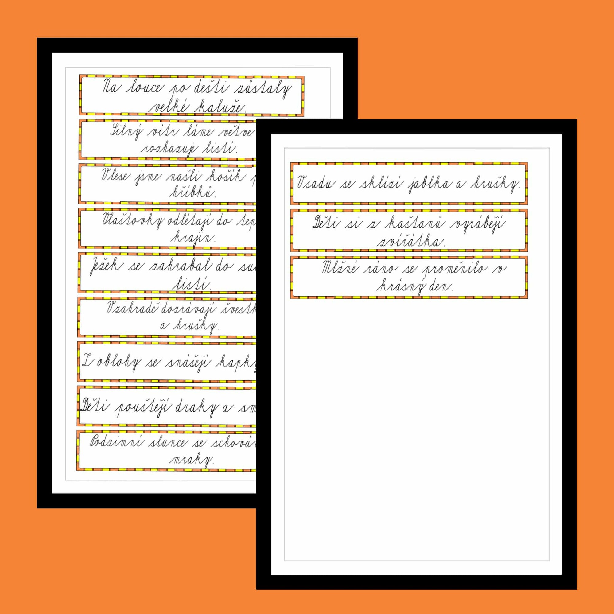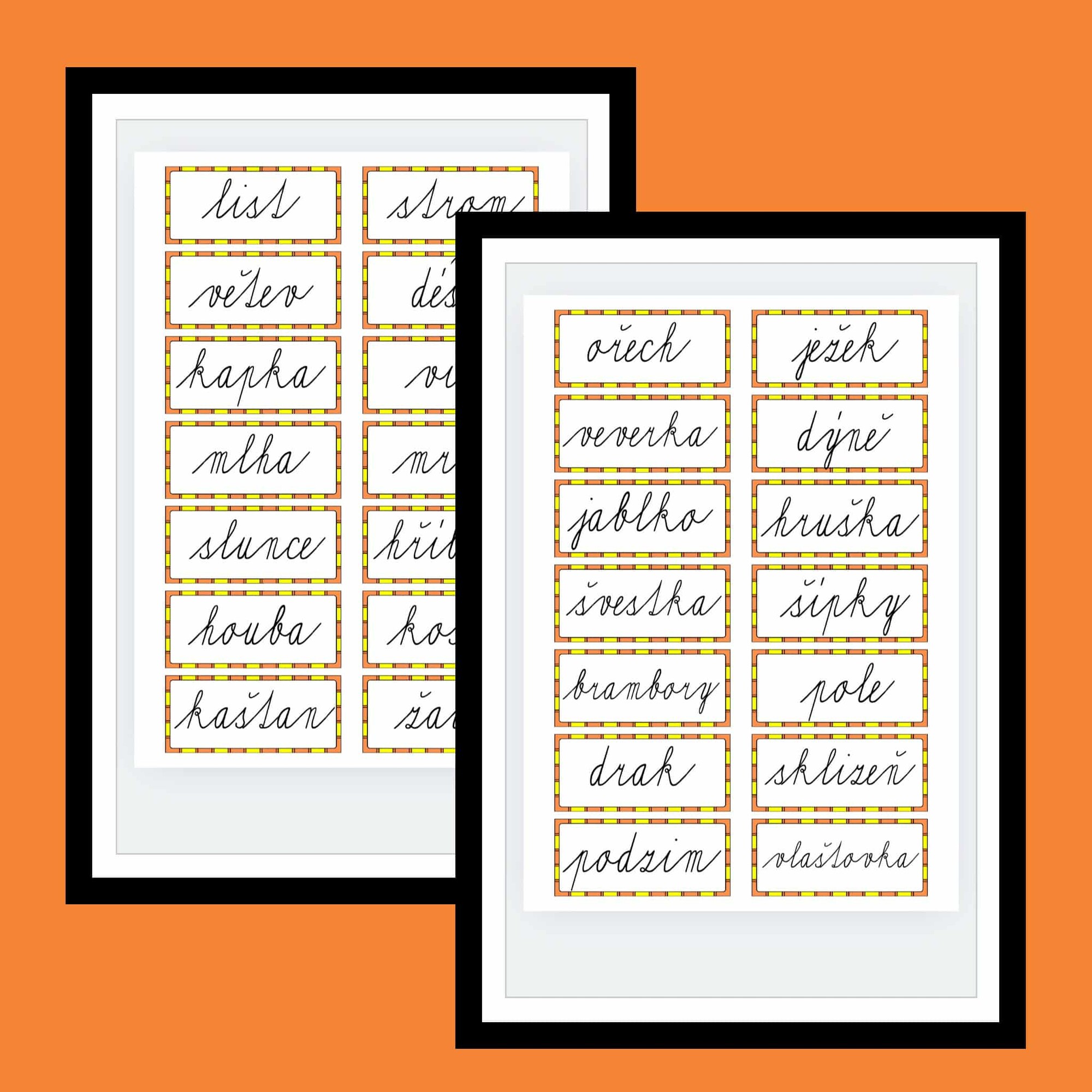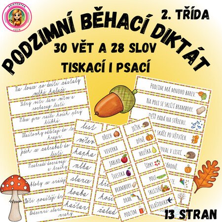 Tento materiál je zaměřen na tematický celek podzim a obsahuje 28 slov a 30 vět v tiskací i psací podobě. Je určen k procvičování čtení a psaní žáků druhého ročníku a lze jej využít jak k opisu, tak k běhacímu diktátu. Texty reflektují charakteristické jevy podzimu, jako jsou změny v přírodě, barevné listí, sklizeň ovoce a zeleniny nebo hry venku při typickém podzimním počasí.