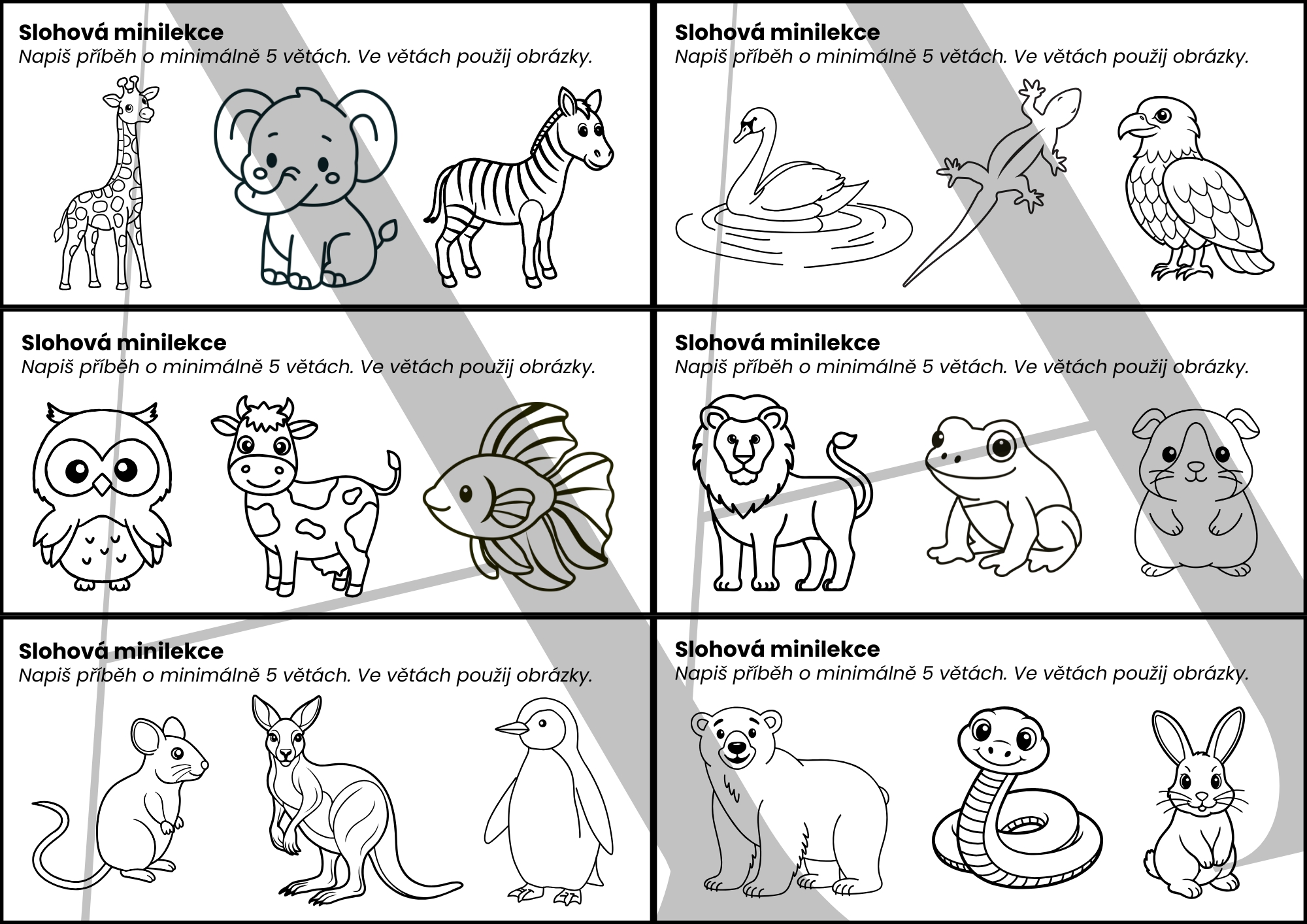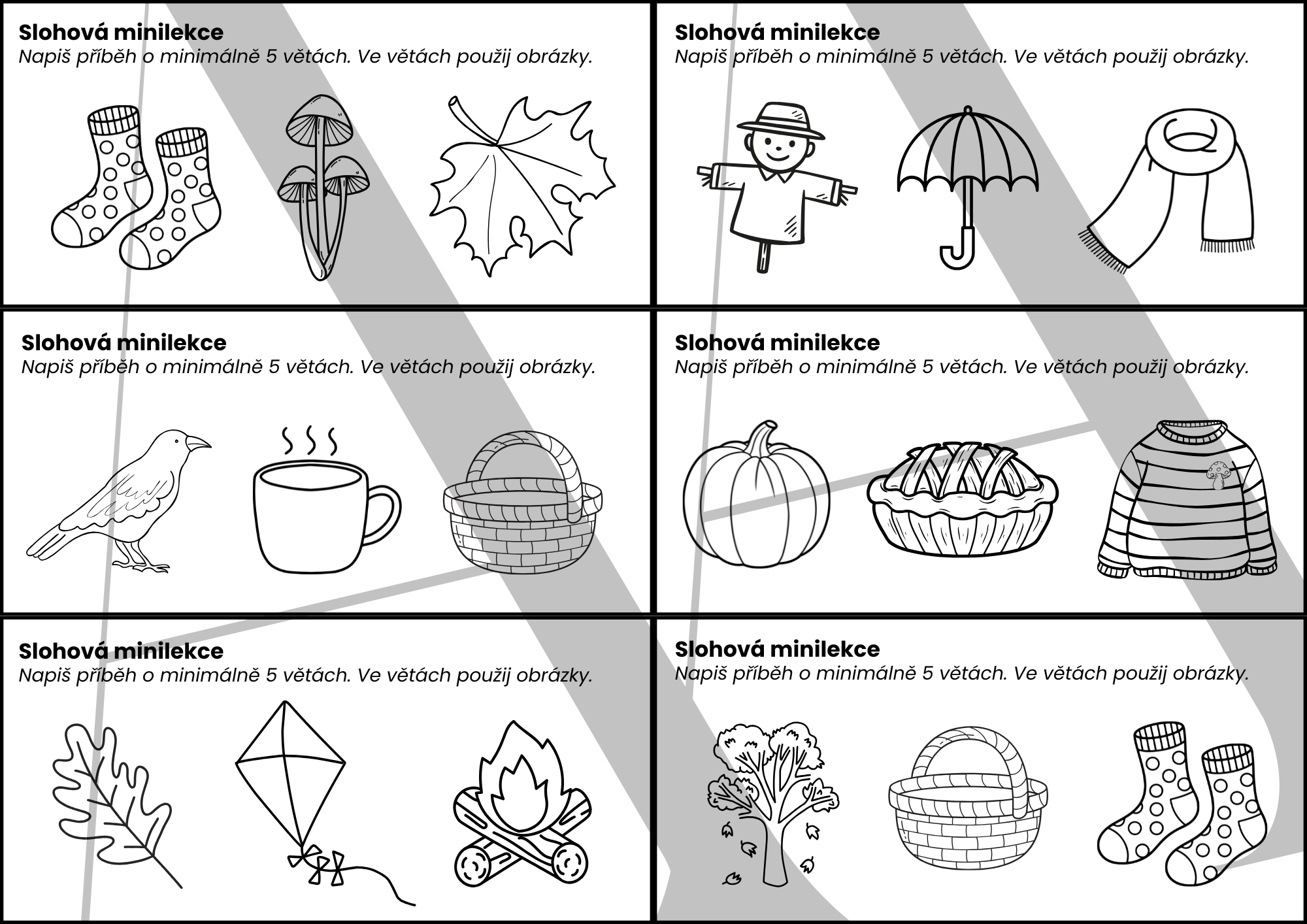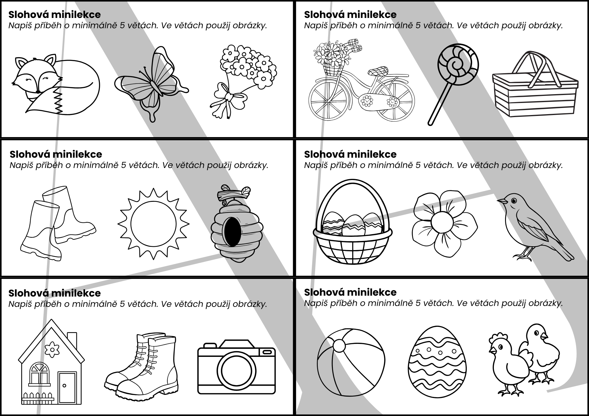 Žáci si do sešitu nalepí tři obrázky z minilekce, kterou si sami zvolí. Obrázky tvoří základ příběhu – žáci podle nich vymyslí krátké vyprávění. Příběh musí mít alespoň 5 vět a dávat smysl (měl by mít začátek, prostředek a konec). Důležité je, aby děj odpovídal obrázkům, ale zároveň nechává prostor pro fantazii a humor. Po dopsání mohou žáci svůj text přečíst spolužákům, porovnat různé nápady nebo vybrat nejzajímavější příběh.