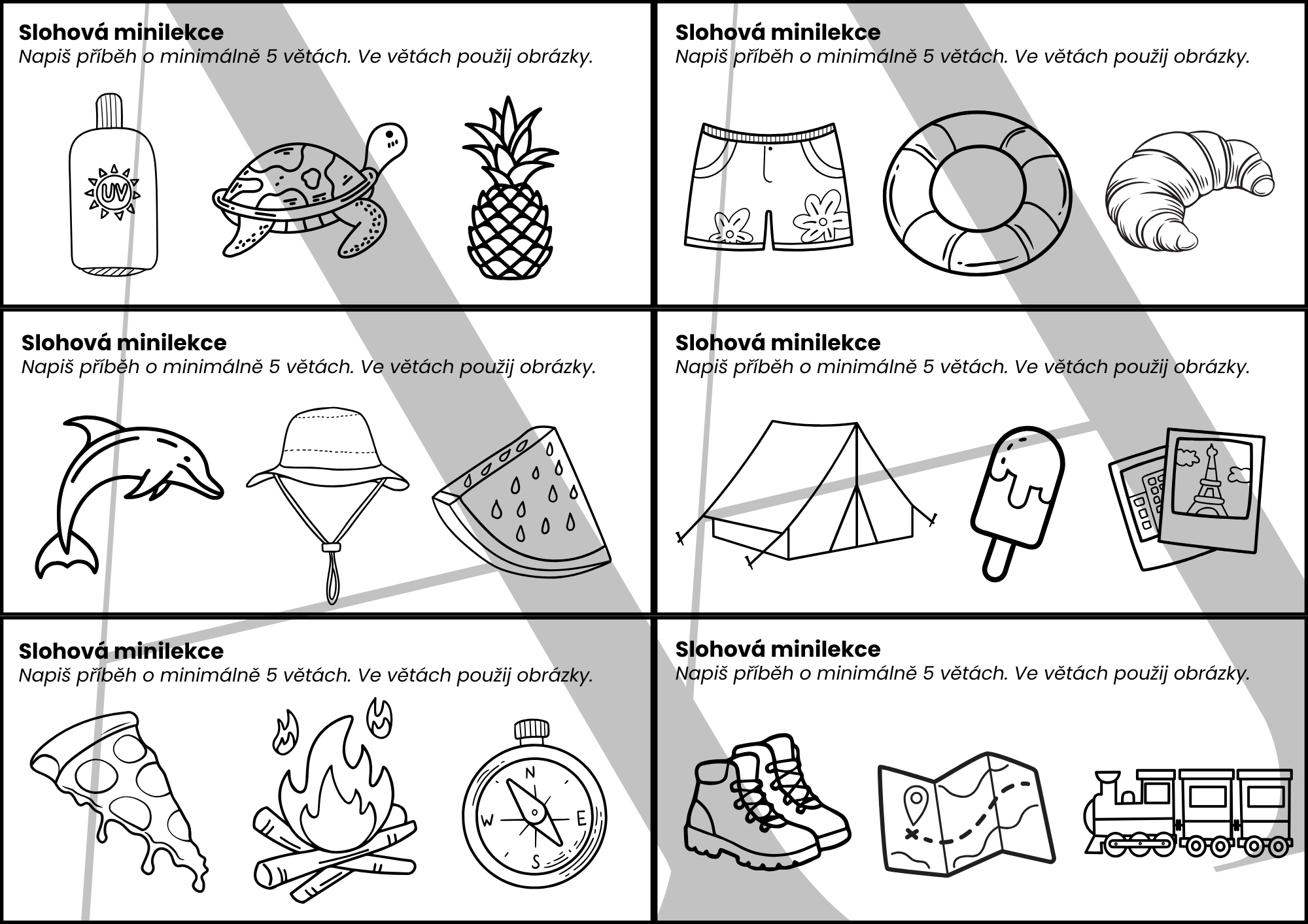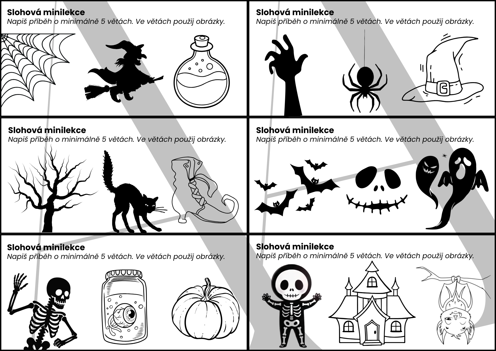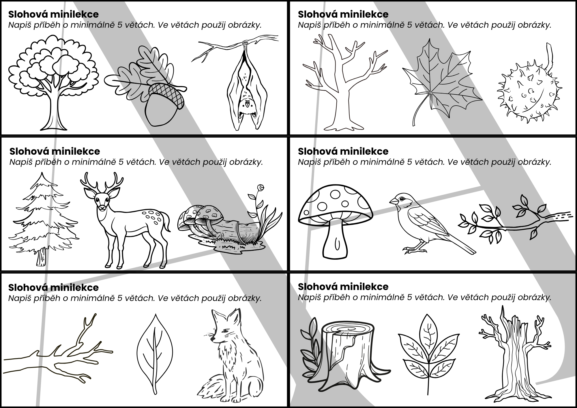 Žáci si do sešitu nalepí tři obrázky z minilekce, kterou si sami zvolí. Obrázky tvoří základ příběhu – žáci podle nich vymyslí krátké vyprávění. Příběh musí mít alespoň 5 vět a dávat smysl (měl by mít začátek, prostředek a konec). Důležité je, aby děj odpovídal obrázkům, ale zároveň nechává prostor pro fantazii a humor. Po dopsání mohou žáci svůj text přečíst spolužákům, porovnat různé nápady nebo vybrat nejzajímavější příběh.