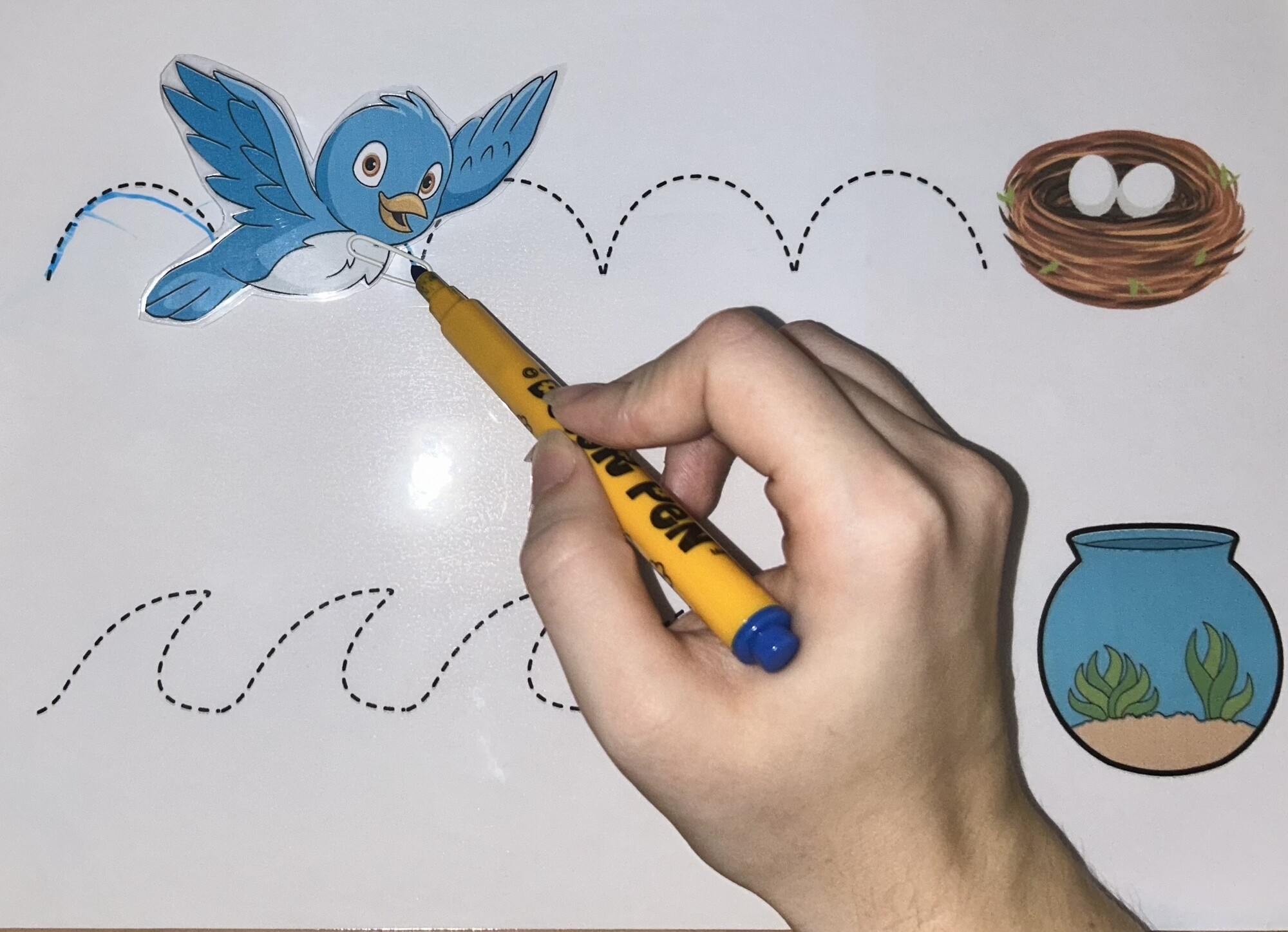 Tato aktivita je určena pro rozvoj jemné motoriky, grafomotoriky a koordinace oko-ruka. Děti pomocí fixy nebo prstu sledují přerušované čáry a pomáhají obrázkům (například ptáčkovi nebo rybce) dostat se na správné místo – ptáček do hnízda a rybka do akvária. Pohyblivé laminované obrázky lze přikládat na začátky drah, aby si dítě představilo „cestu“, kterou má sledovat.