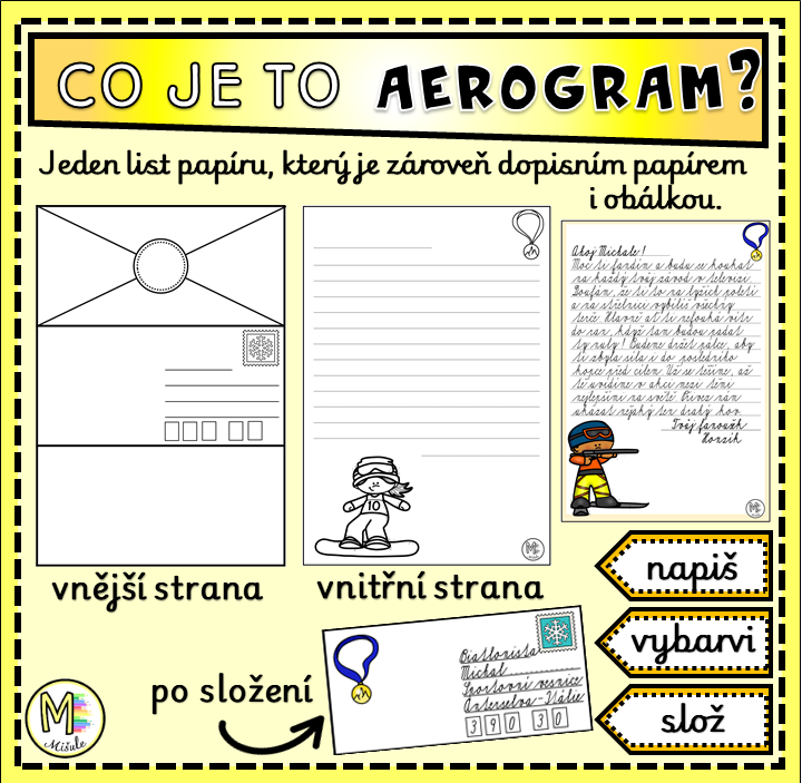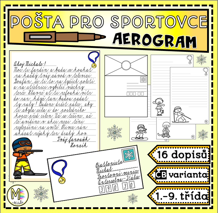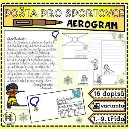 Pošta pro sportovce – Aerogram je tematický výukový materiál zaměřený na rozvoj psaného projevu, čtenářské a pisatelské gramotnosti a upevnění pravidel psaní dopisu.