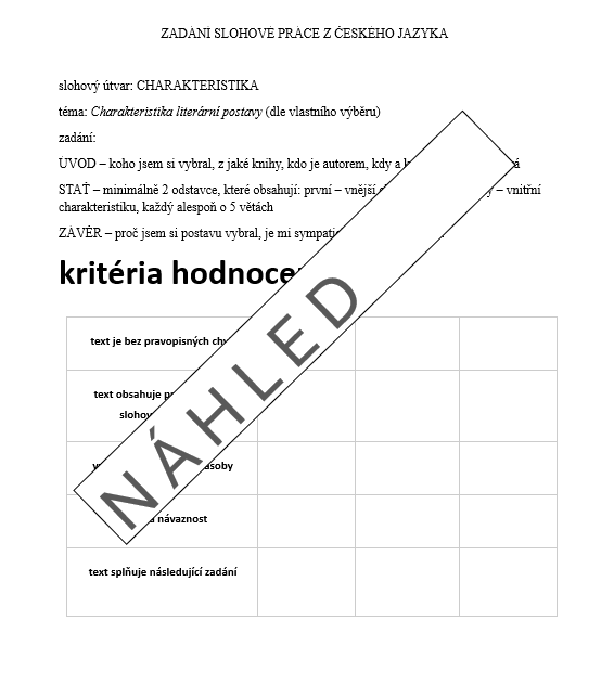 Materiál obsahuje 20 zadání slohových prací a tabulku s kritérii hodnocení, vše lze jednoduše upravovat dle svých potřeb.