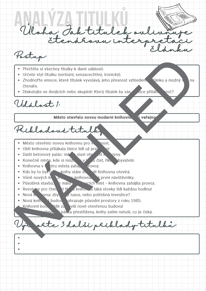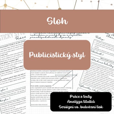 Materiál se zaměřuje na procvičování základních znaků publicistického stylu a práci s texty tohoto stylu. Žáci identifikují funkce textů, zařazují texty do rubrik, pracují se stálými prvky novin a s obrácenou pyramidou. Určují, jaké jsou rozdíly mezi seriózním a bulvárním textem, a analyzují titulky (z hlediska stylu, emocí, které titulek vyvolává, přiřazují, pro jaké noviny je titulek typický).