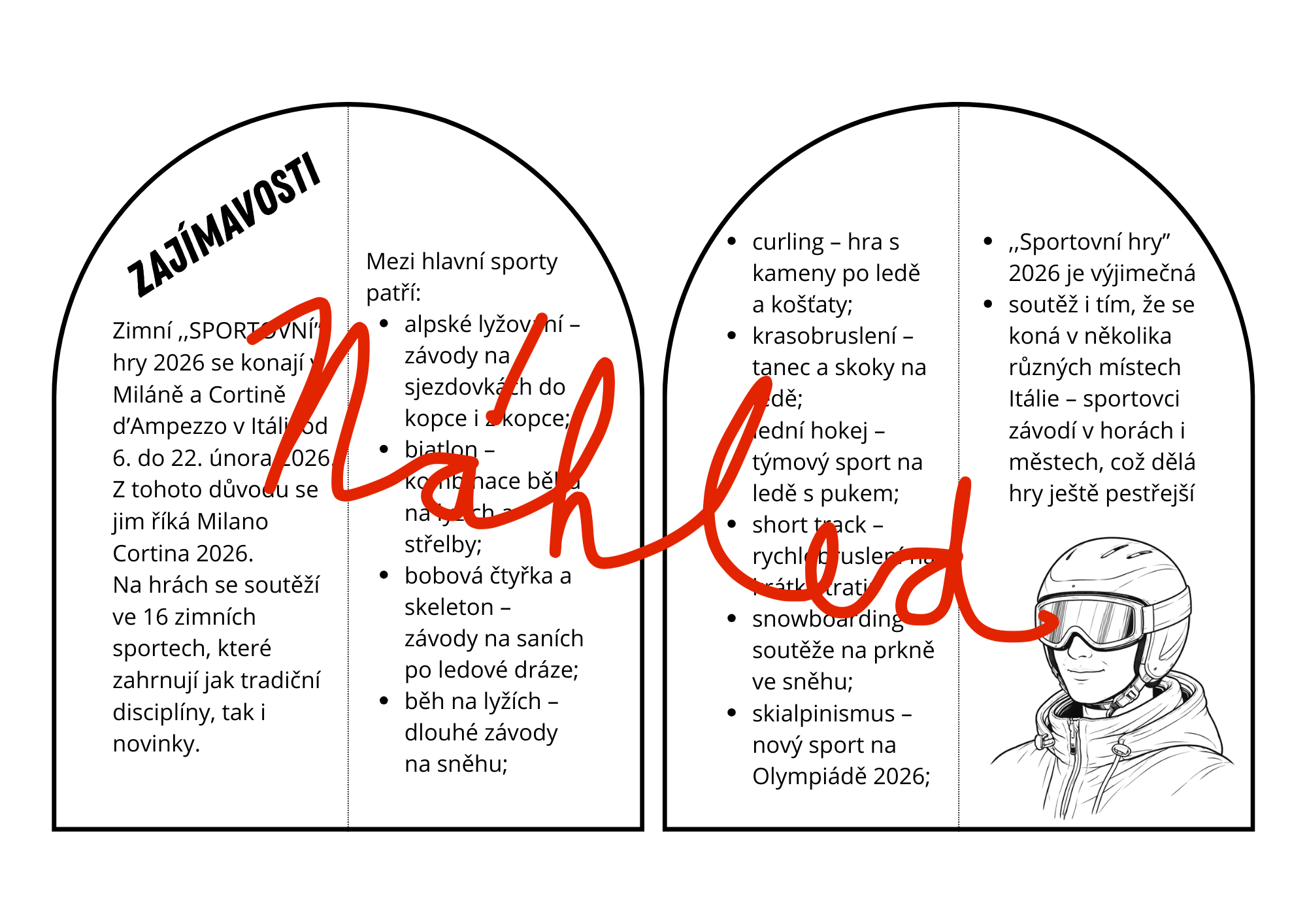 Materiál o zimních sportovních hrách nabízí propojení výtvarné činnosti, práce s textem a rozvoje osobních kompetencí žáků. Díky jasné struktuře, otevřeným úkolům a vizuálně atraktivnímu zpracování je vhodný jak pro běžnou výuku, tak pro projektové dny. Navazuje na principy materiálu s okénky a dává učiteli prostor přizpůsobit práci konkrétní třídě i časovým možnostem.