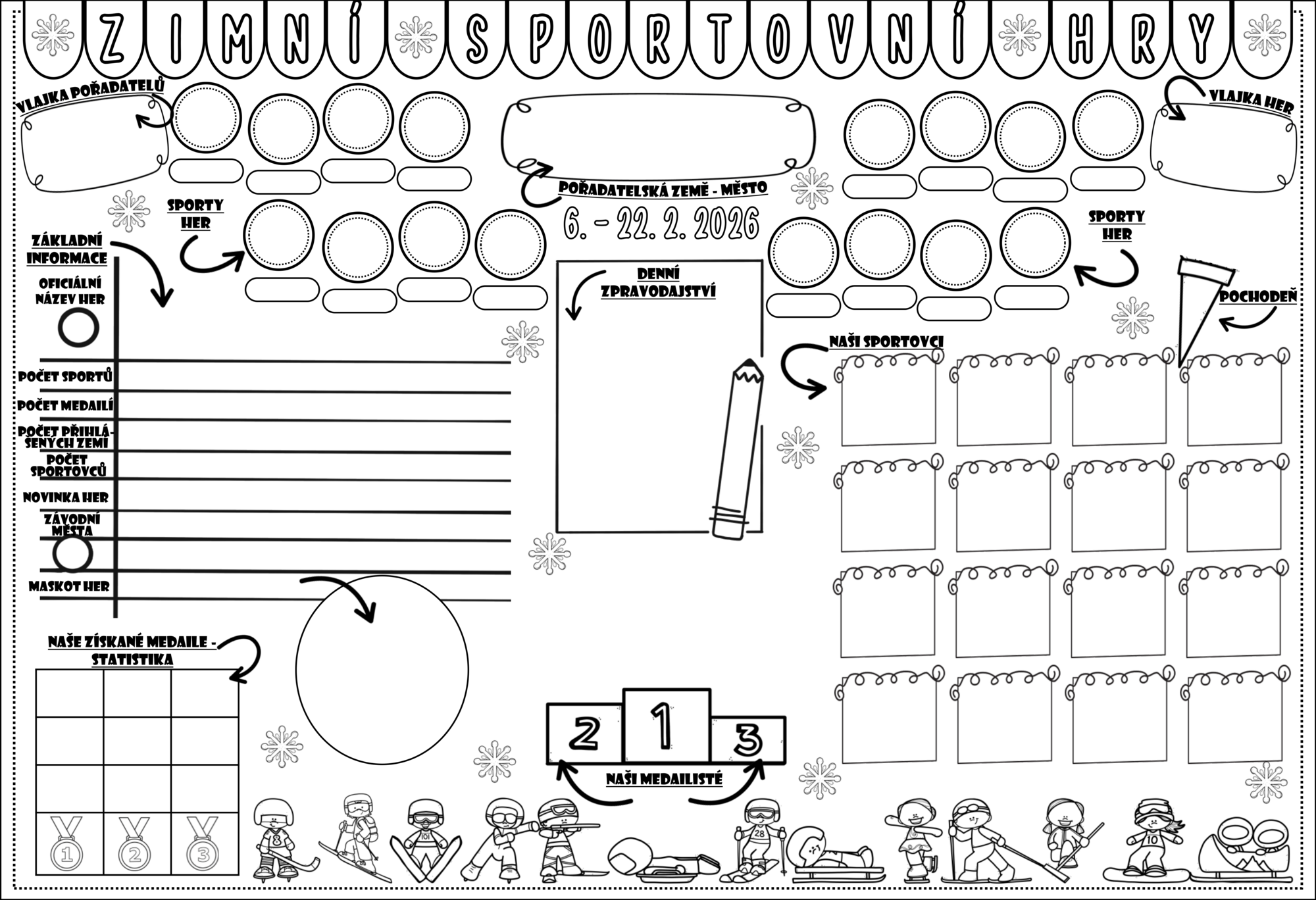 Představte si interaktivní informační centrum, které má rozměry 150 x 100 cm a které roste pod rukama vašich žáků. Není to jen statický obraz na stěně, ale dynamická pracovní plocha, která reaguje na aktuální dění. Žáci do něj den po dni doplňují výsledky, vlepují profily sportovců, vybarvují medailové grafy a píší reportáže z klíčových momentů.