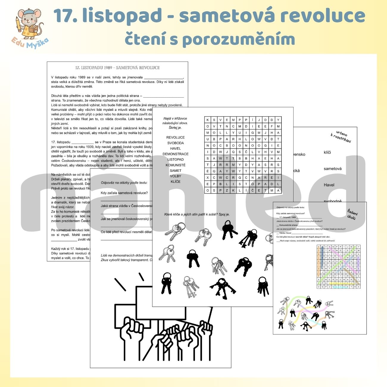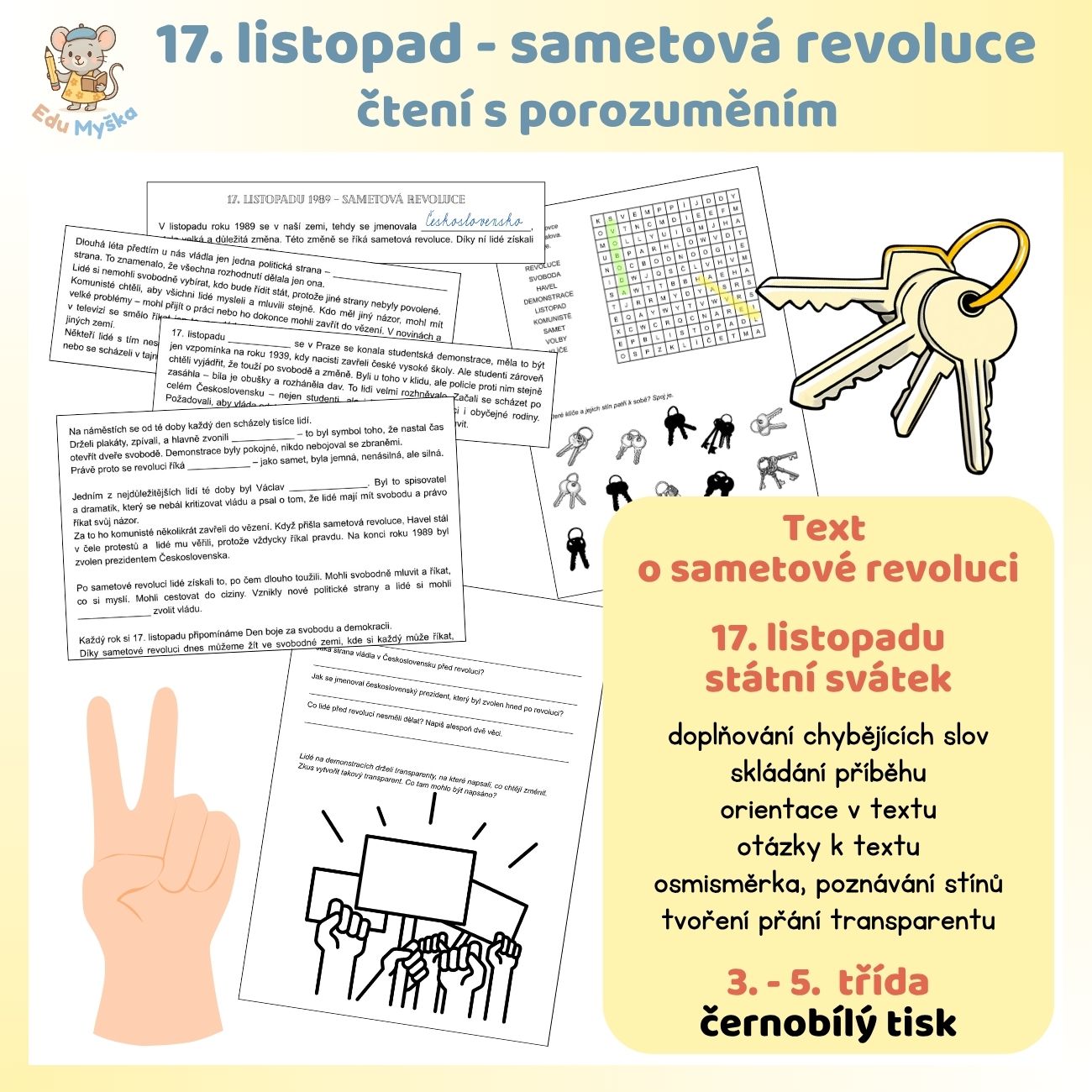Dále obsahuje otázky k textu a prostor pro vytvoření transparentu při demonstraci, osmisměrku, spojování klíčů s odpovídajícím stínem.