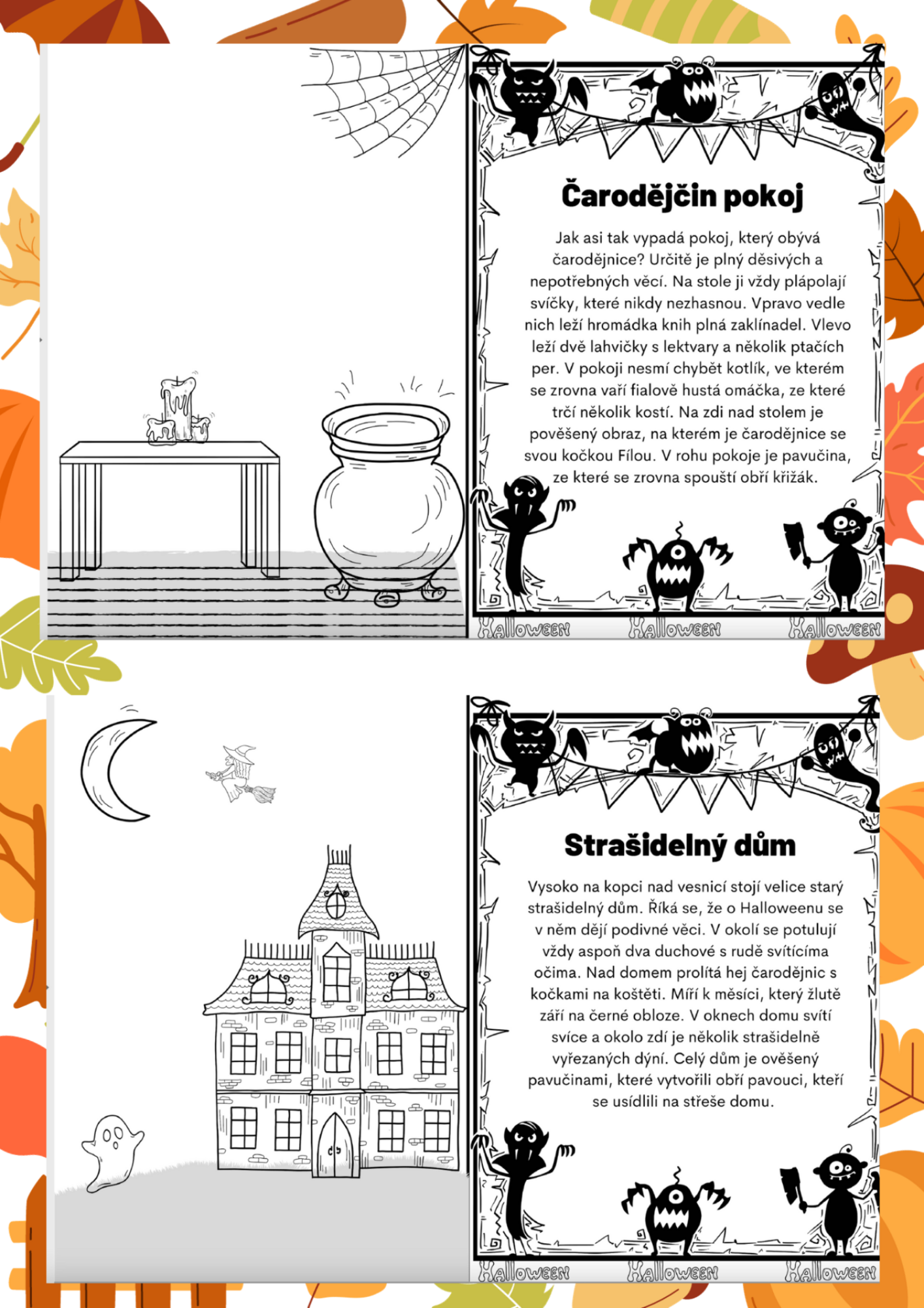 Děti vybarvují omalovánky na základě přečteného textu, který se týká Halloweenu. Dochází tak k procvičování čtení s porozuměním.