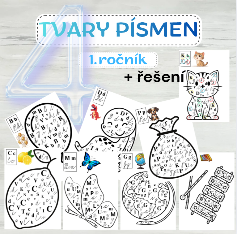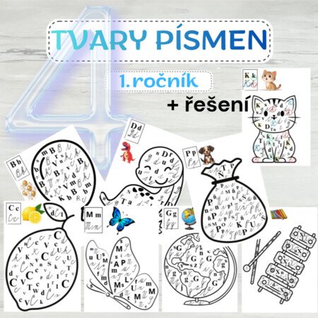 Pracovní listy stačí vytisknout. Děti hledají 4 tvary písmen.
