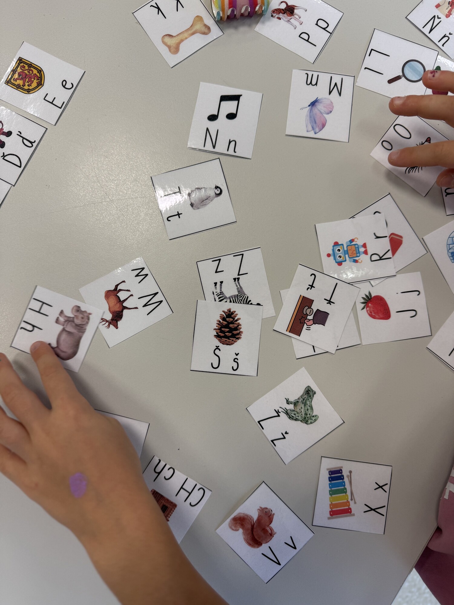 - Závod dvojic – dvě děti soutěží, kdo rychleji poskládá část abecedy (např. A–H).