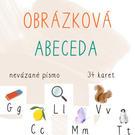 - 34 karet abecedy, každá karta doplněná obrázkem. Písmena jsou psaná nevázaným písmem.