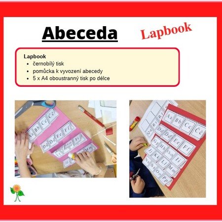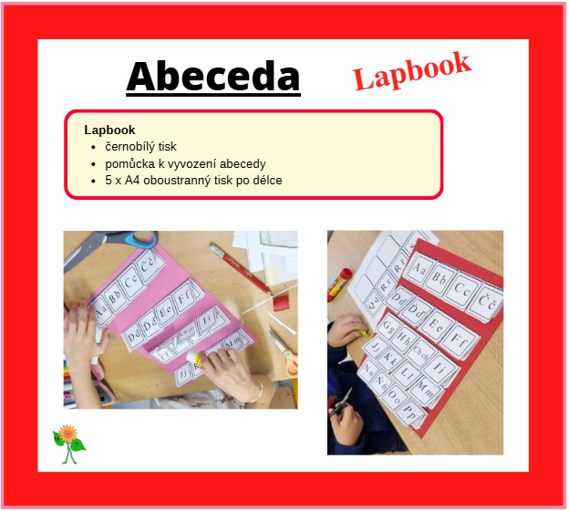 Děti si při tvorbě lapbooku upevňují posloupnost jednotlivých písmen v abecedě i jejich tvar. Po vytvoření si mohou děti ke každému písmenu do okénka vpisovat slova se stejným počátečním písmenem, které si zvýrazní. Prakticky si tak vyzkouší, jak slova podle abecedy seřadit.