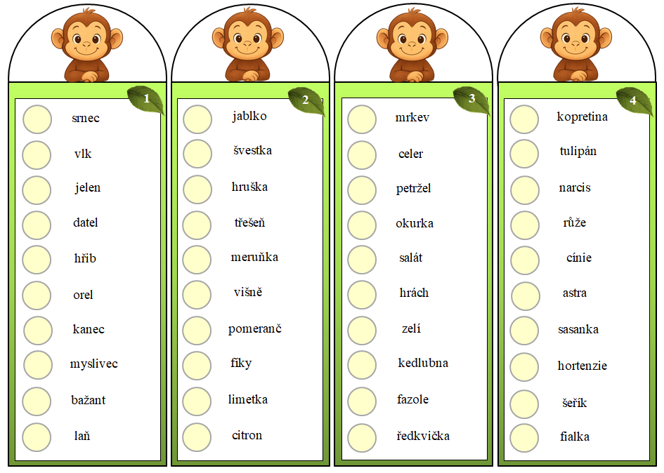Materiál slouží k procvičování učiva 2. ročníku , obsahuje 32 kartiček s 10 slovy a kontrolou. Každý žák si vybere jednu