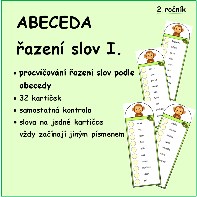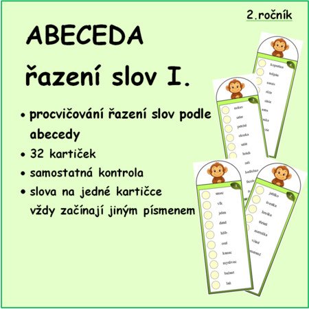 Materiál slouží k procvičování učiva 2. ročníku, obsahuje 32 kartiček s 10 slovy a kontrolou. Každý žák si vybere jednu kartičku a do žlutých políček napíše číslice od 1-10 podle toho v jakém pořadí daná slova jdou podle abecedy. Následně provede kontrolu. Počáteční písmeno slov se na jedné kartičce neopakuje.